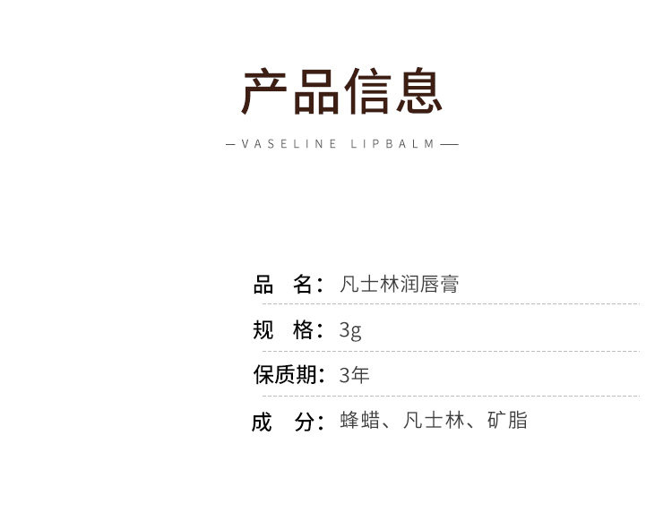 | 产品名称 : | 凡士林润唇膏男女秋冬滋润保湿补水唇膜防干裂去死皮淡化唇纹 |