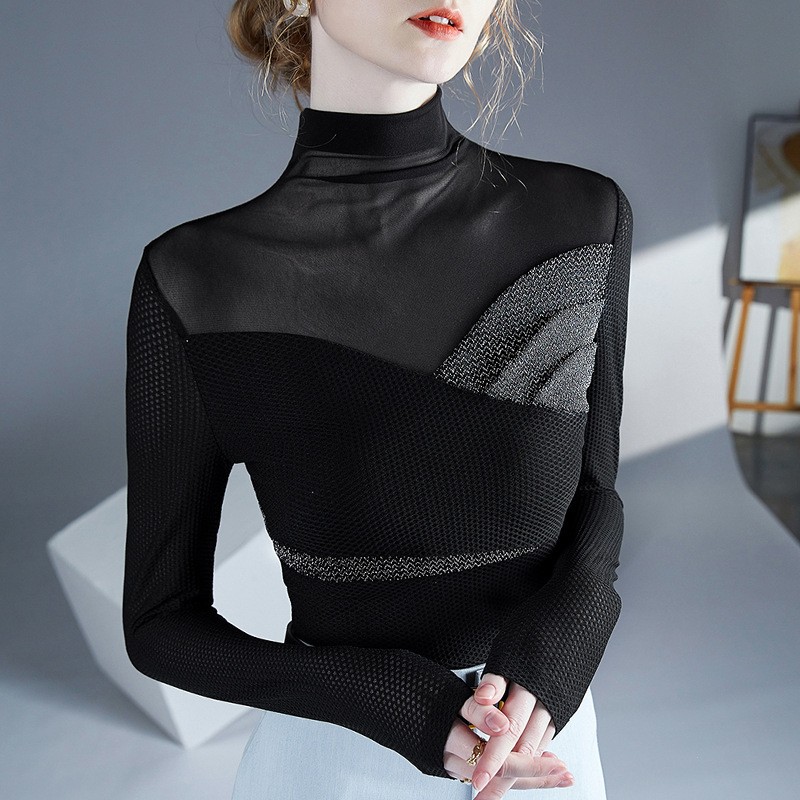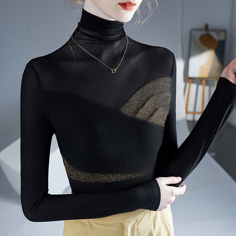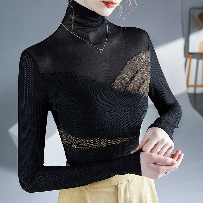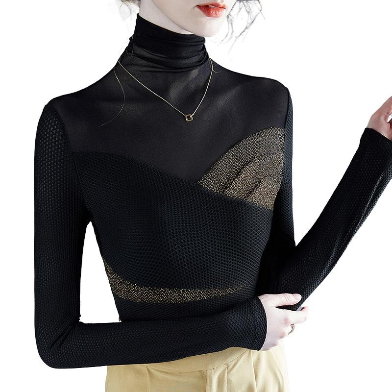 2025春装气质春秋冬新款高领打底衫时尚亮丝设计内搭网纱拼接...