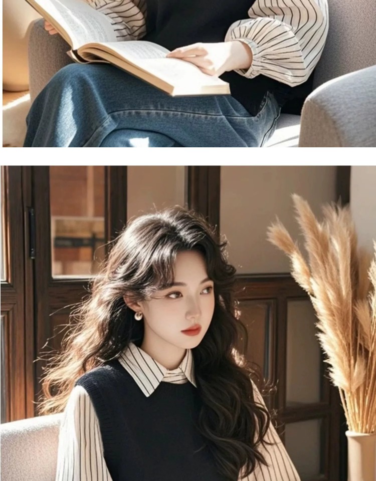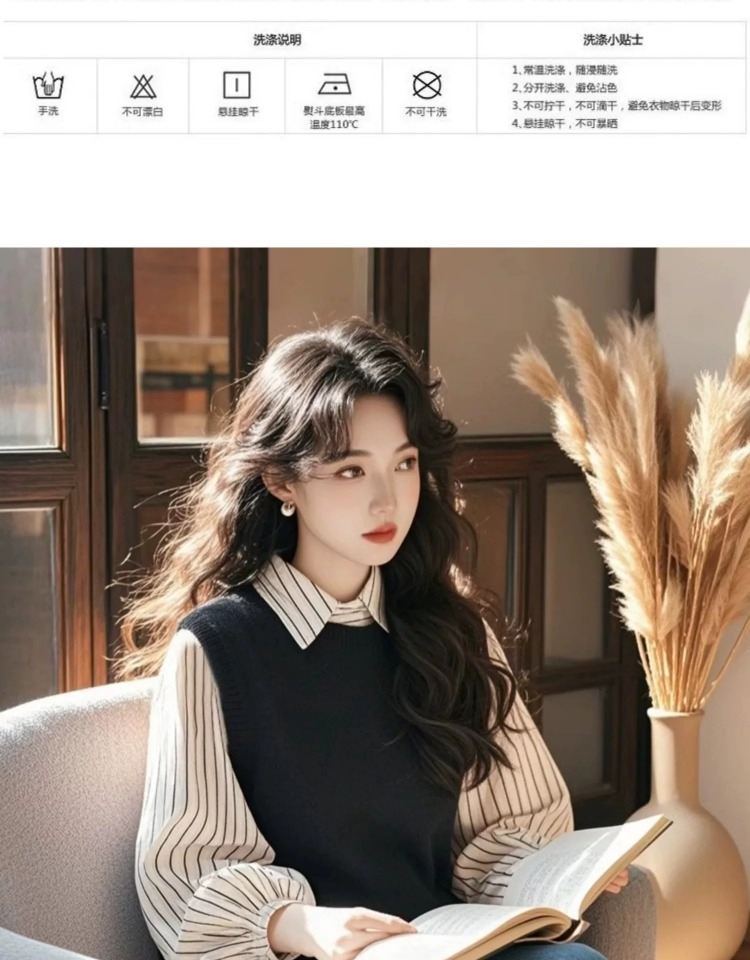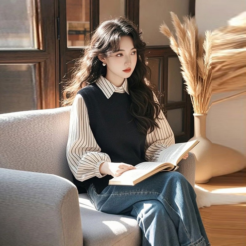 2025秋装长袖上衣女超好看独特漂亮假两件条纹撞色洋气减龄衬...