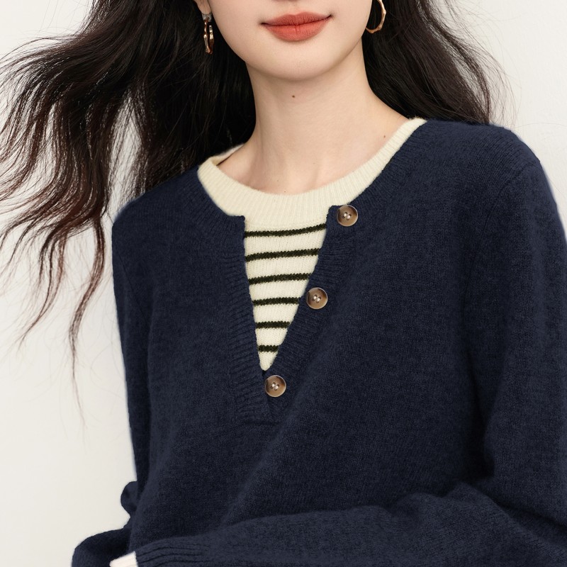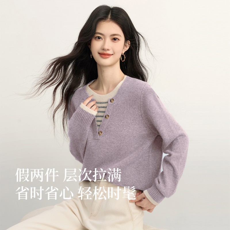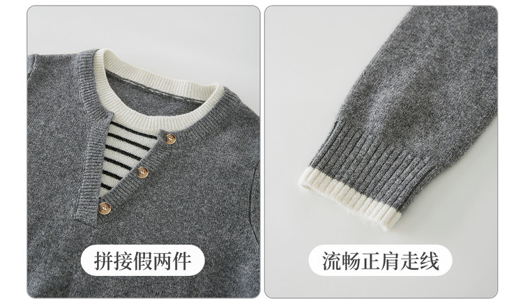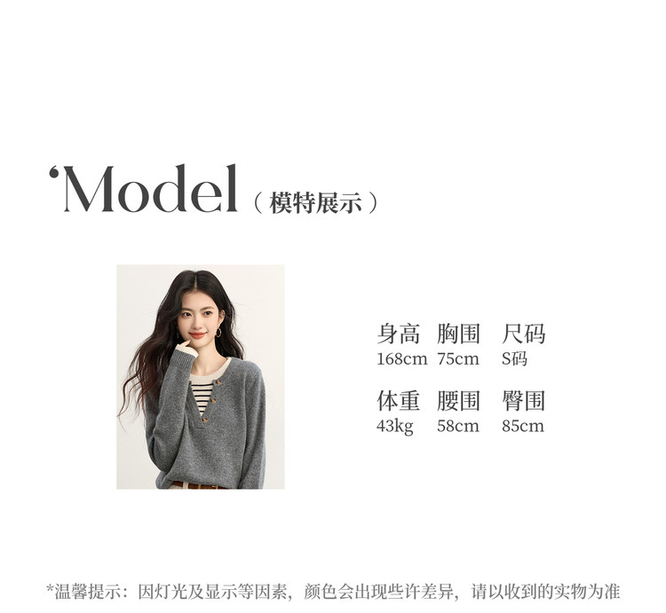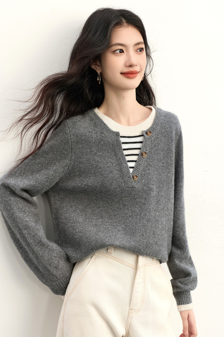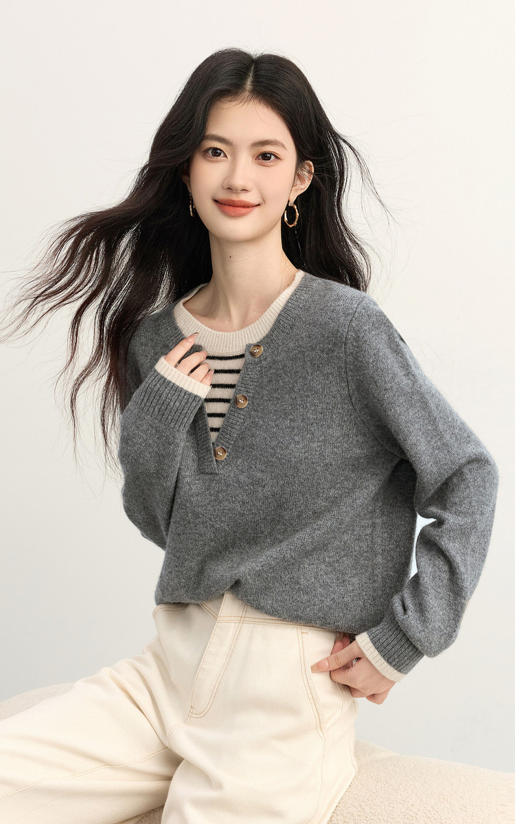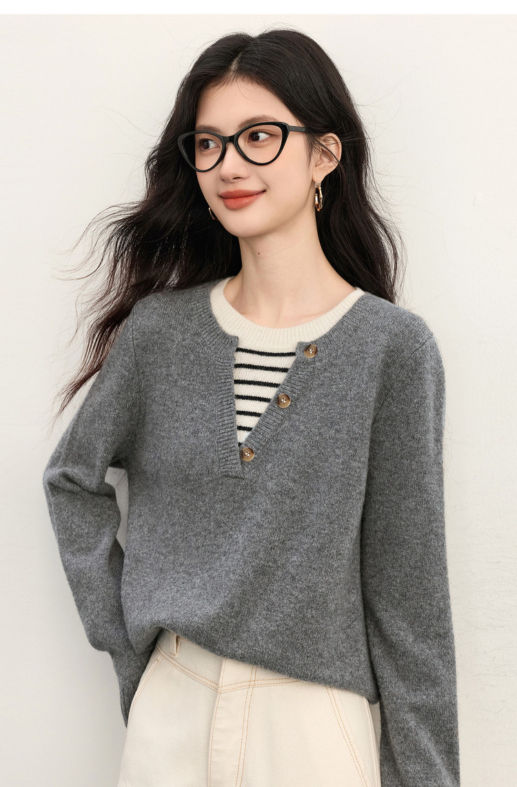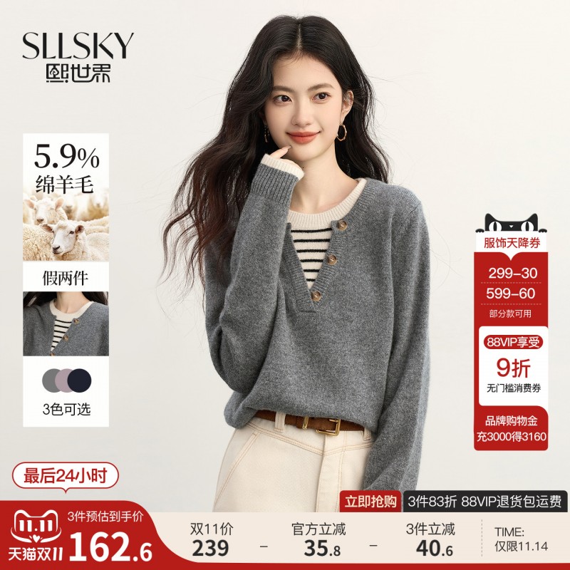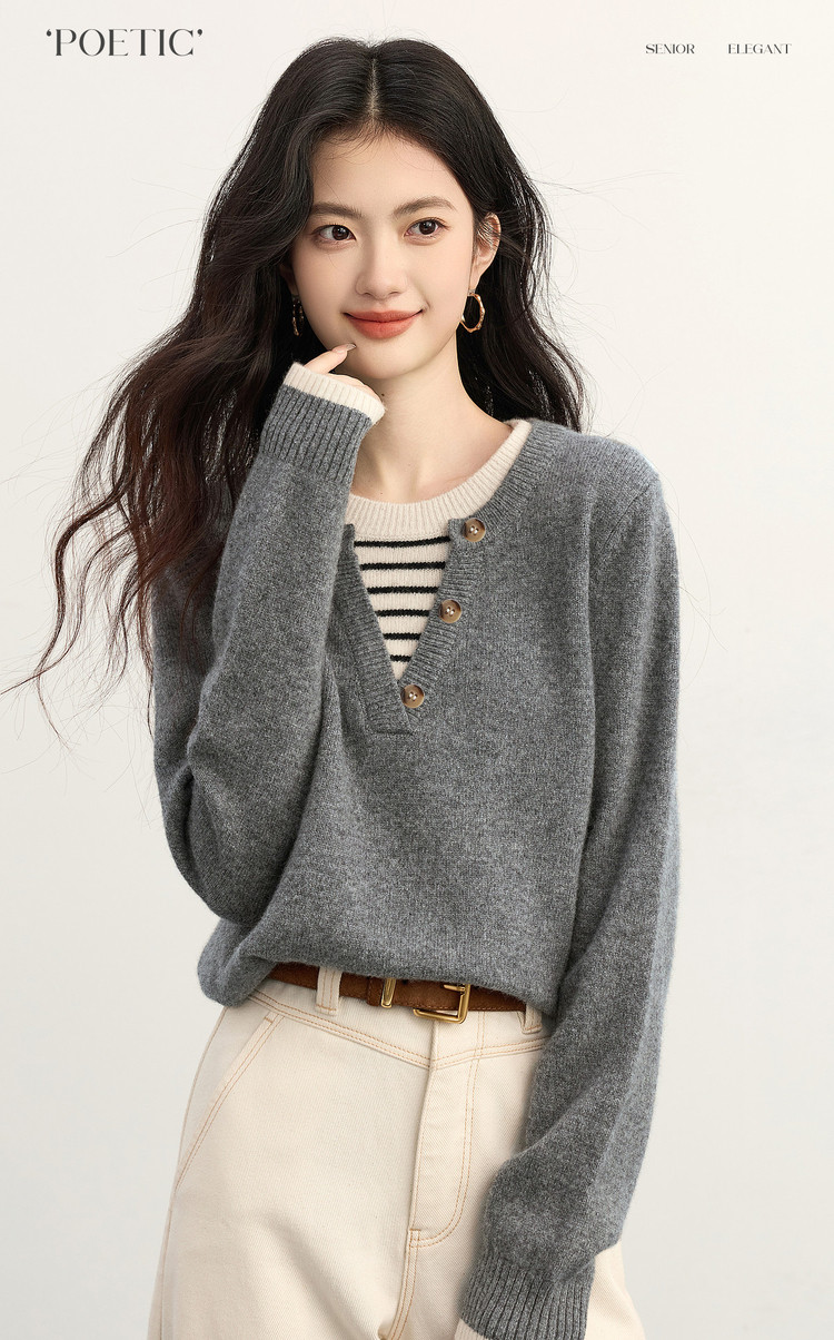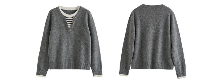 熙世界假两件条纹拼接灰色毛衣女2025秋冬季慵懒松弛感针织套...