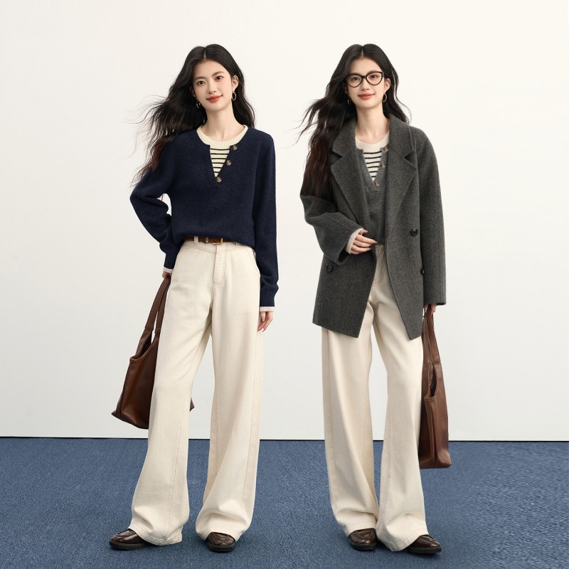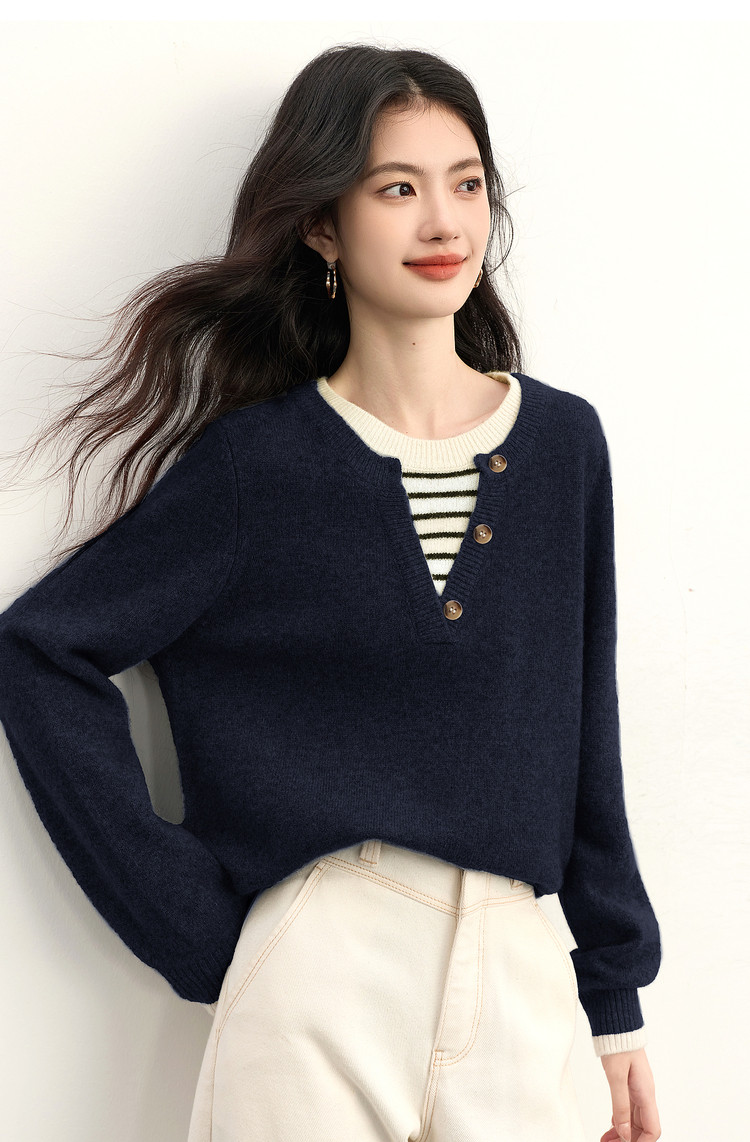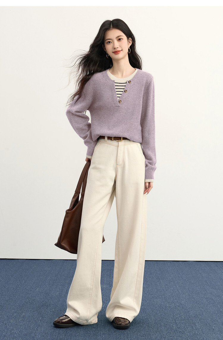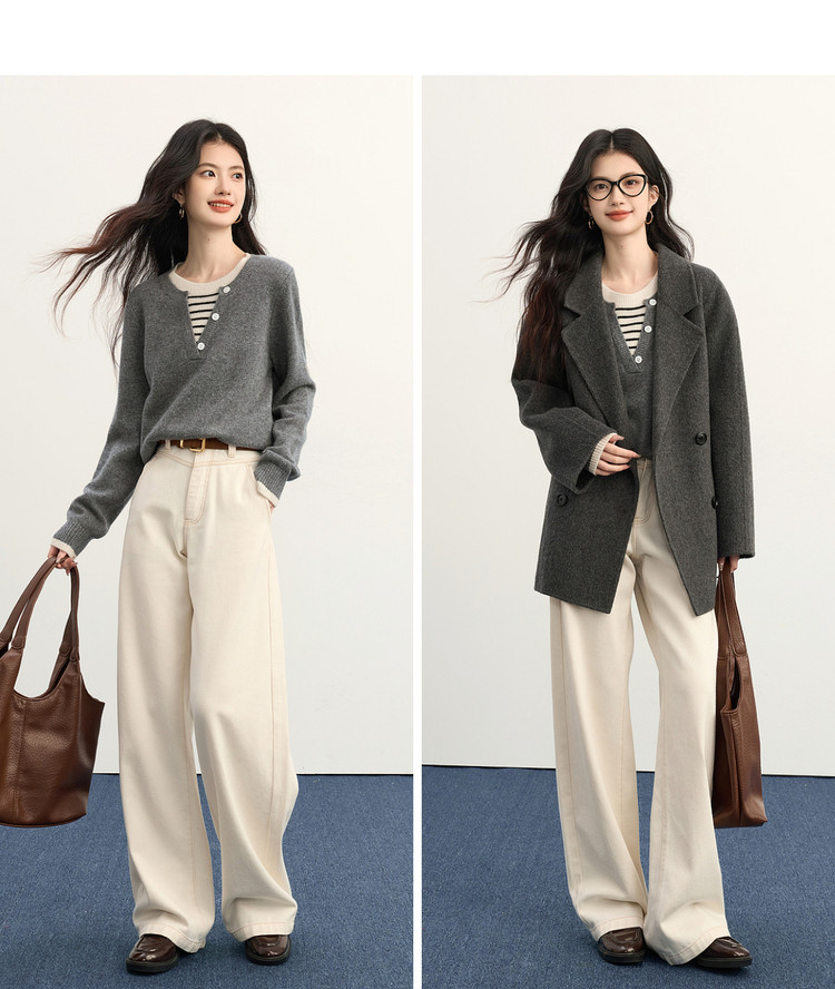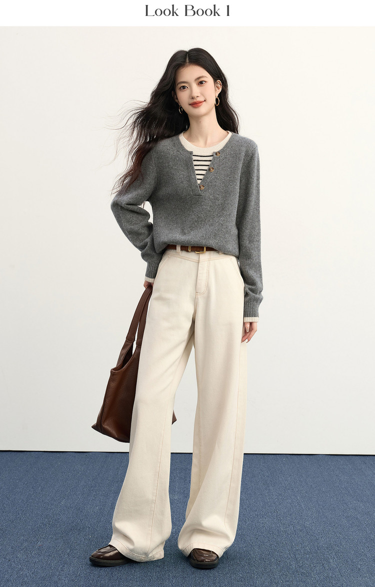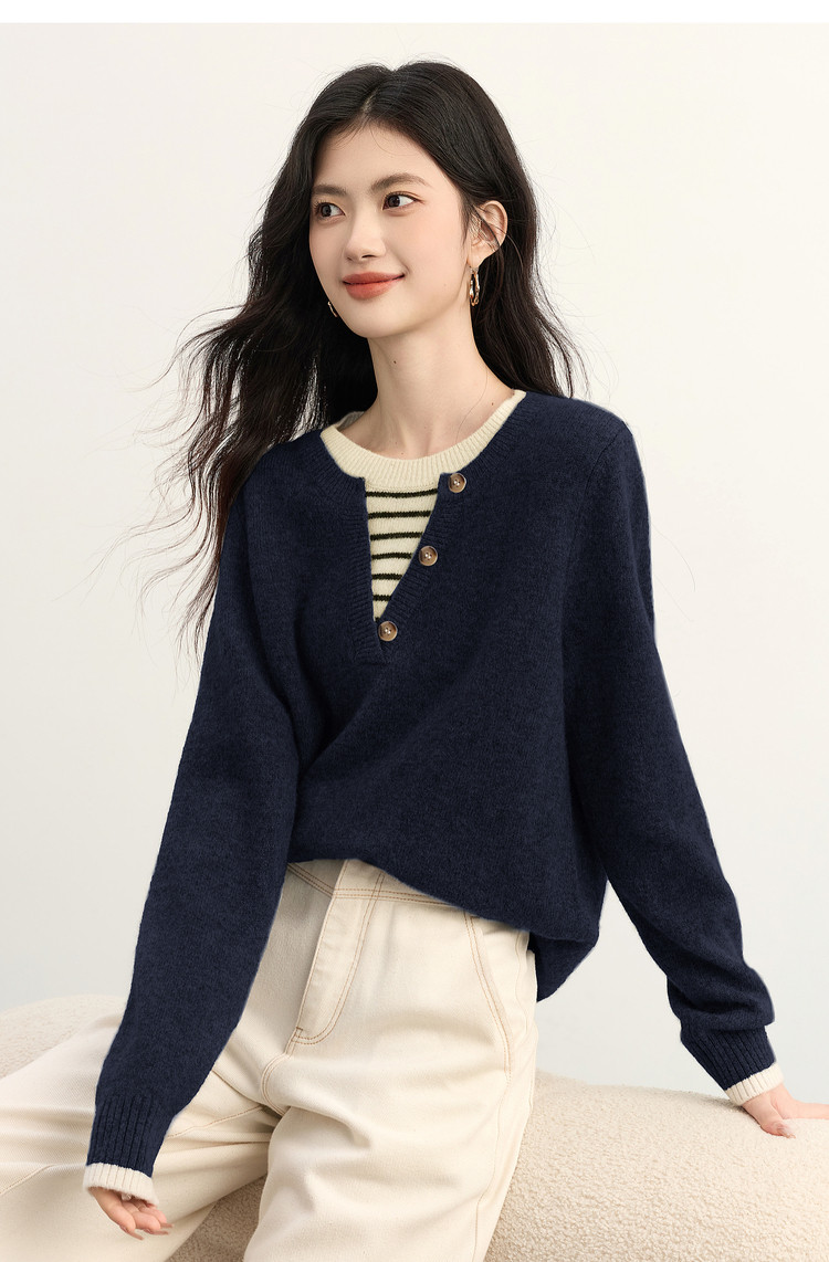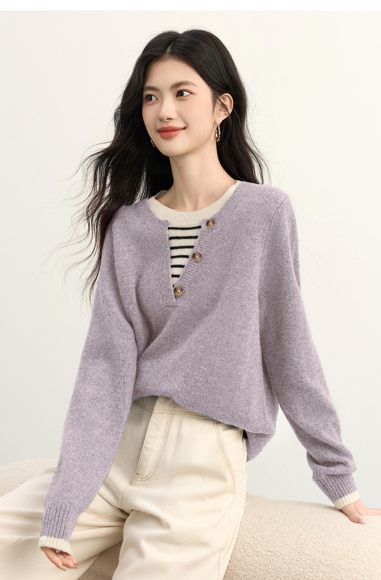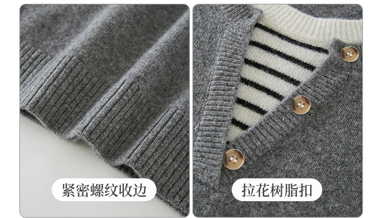 熙世界假两件条纹拼接灰色毛衣女2025秋冬季慵懒松弛感针织套...