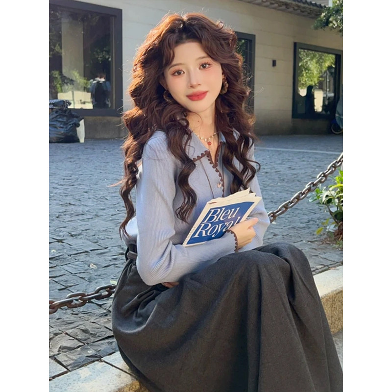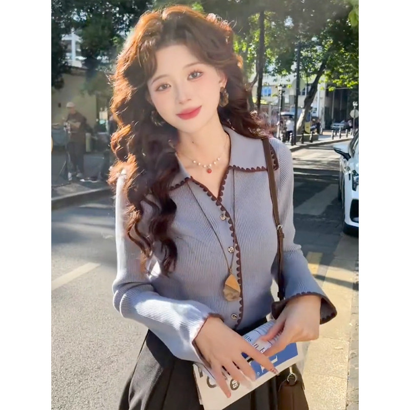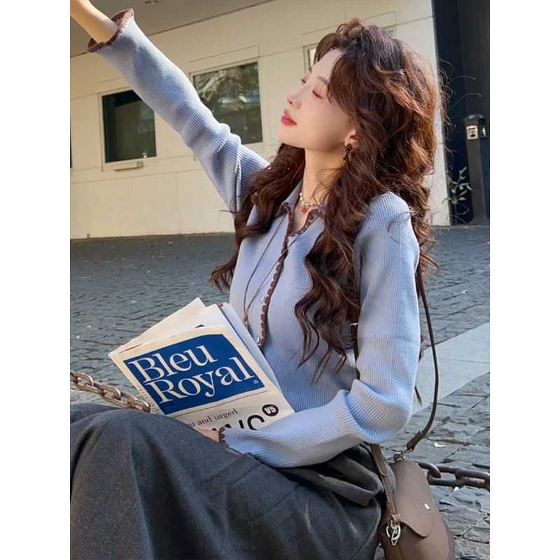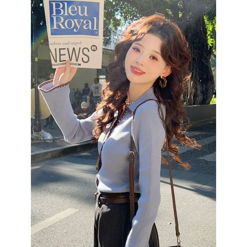 独特漂亮超好看翻领蓝色毛衣女2025新款秋季穿搭内搭打底针织...