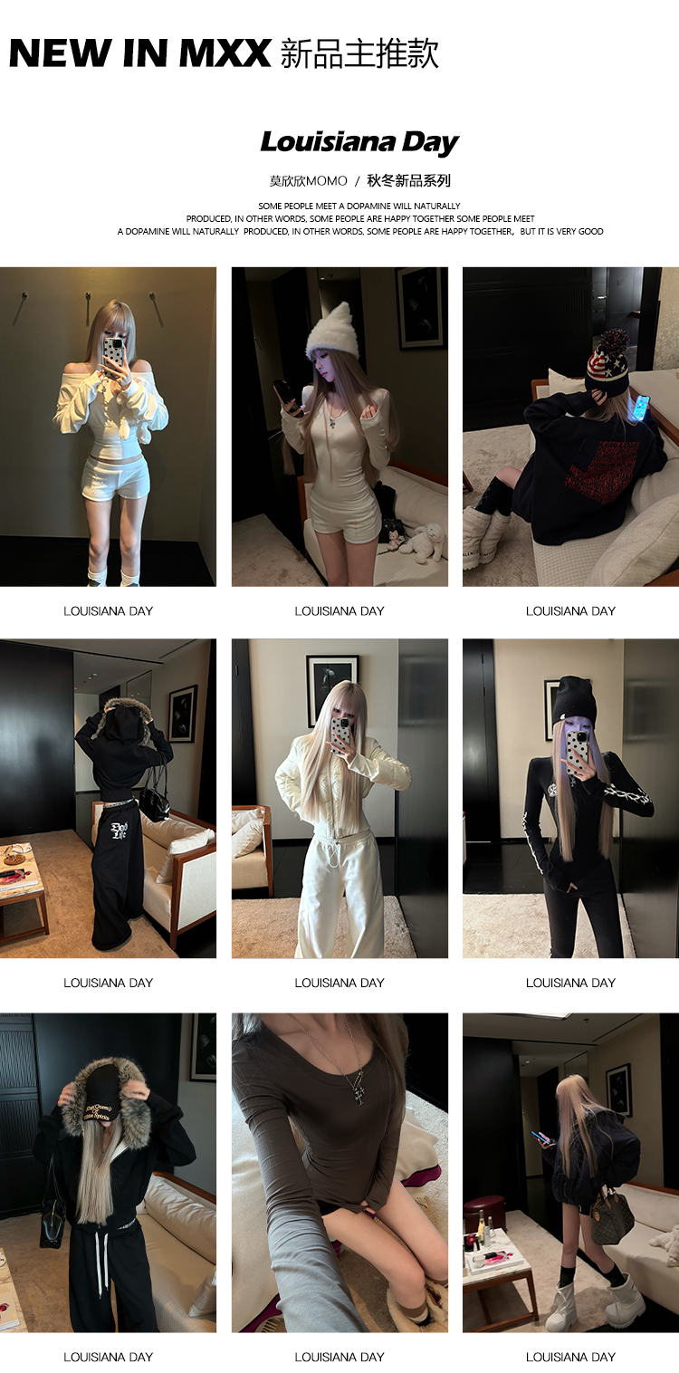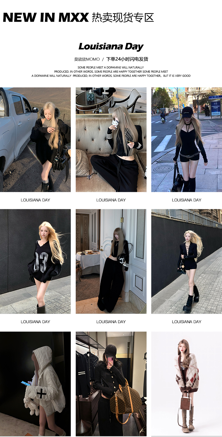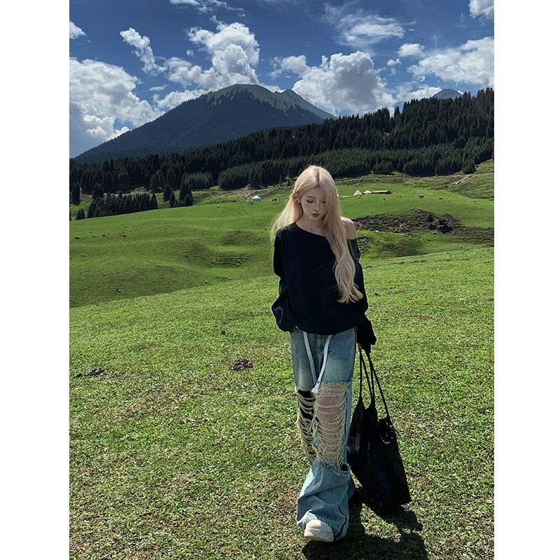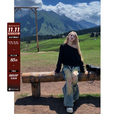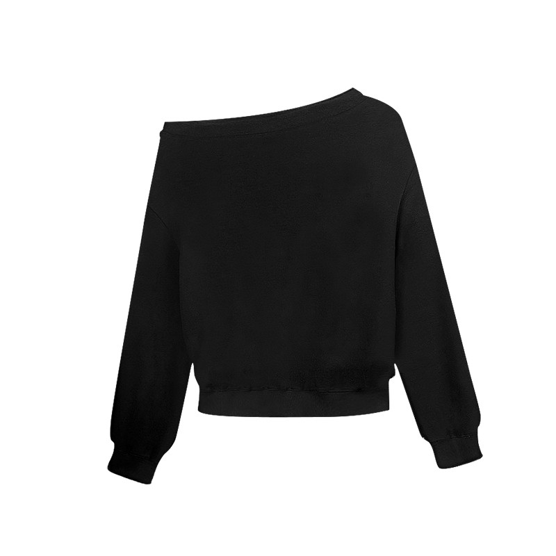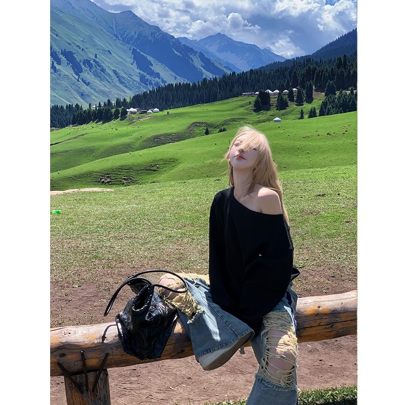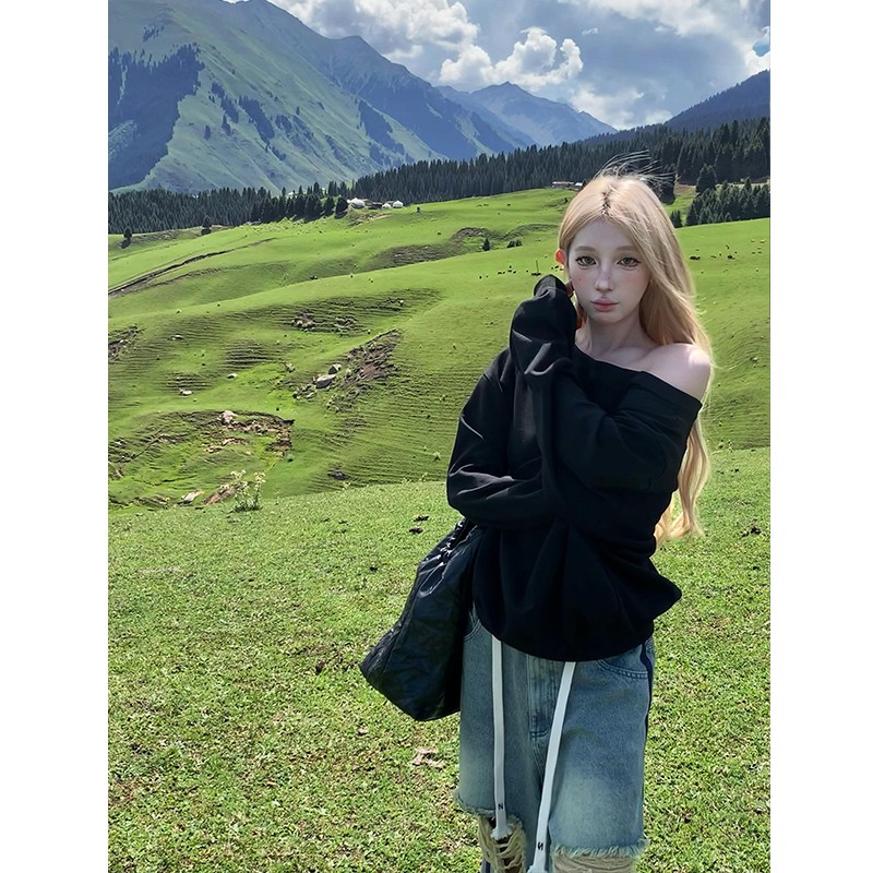 莫欣欣 黑色斜肩卫衣外套女秋冬宽松设计感美式辣妹露肩长袖上衣