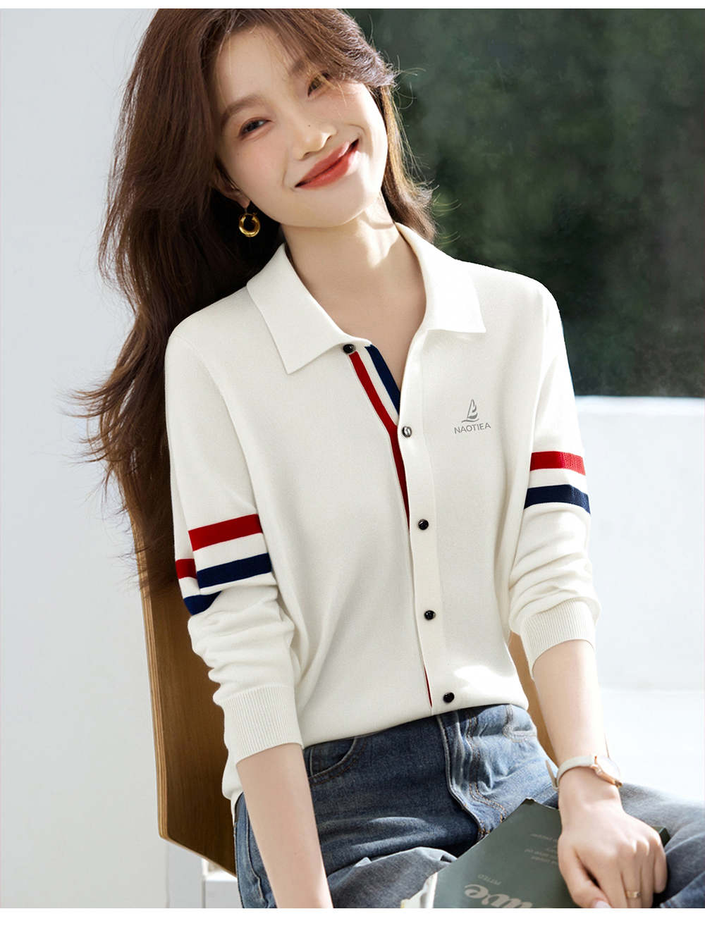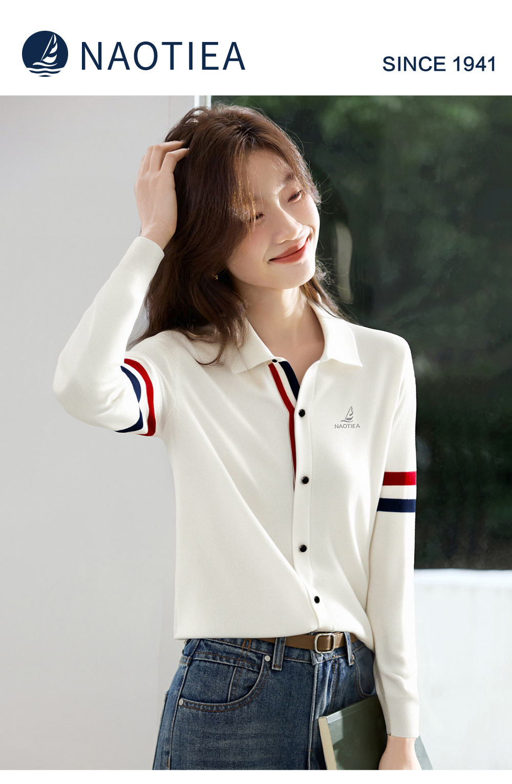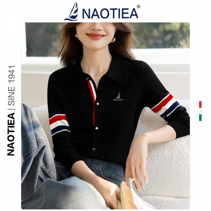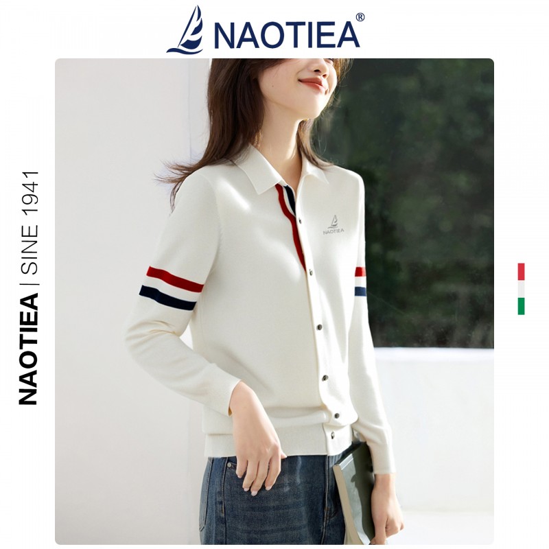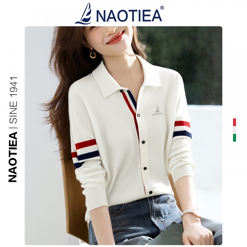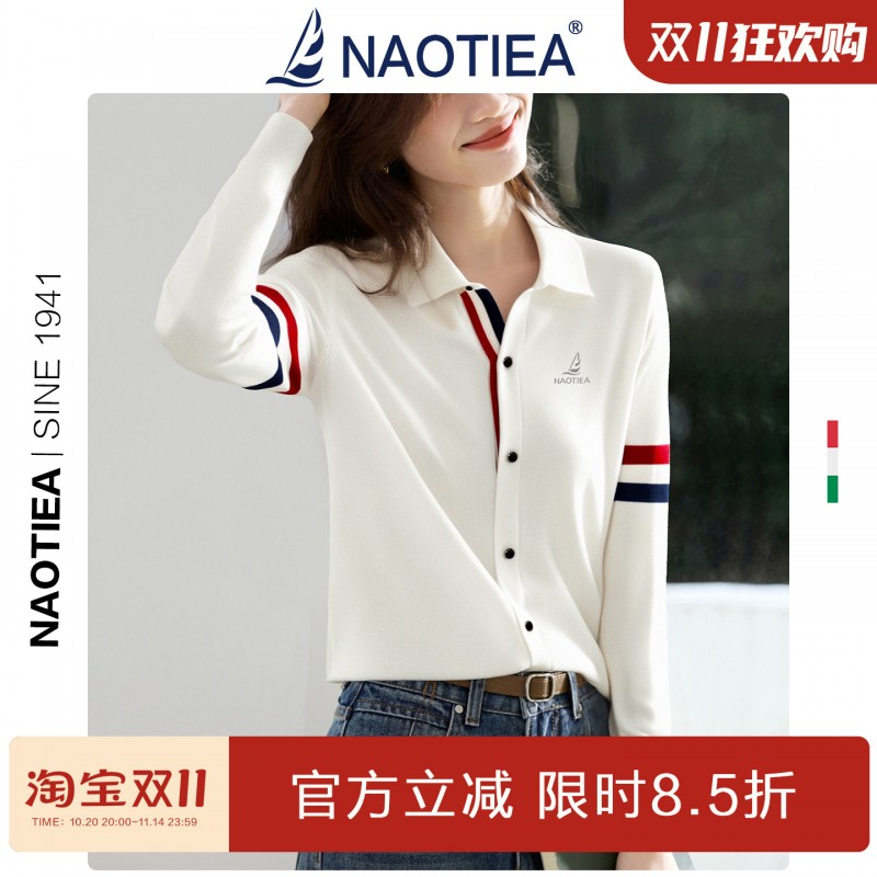 | 产品名称 : | NAOTIEA意大利小帆船白色半开POLO领长袖女2025秋英伦风针织衬衫 |