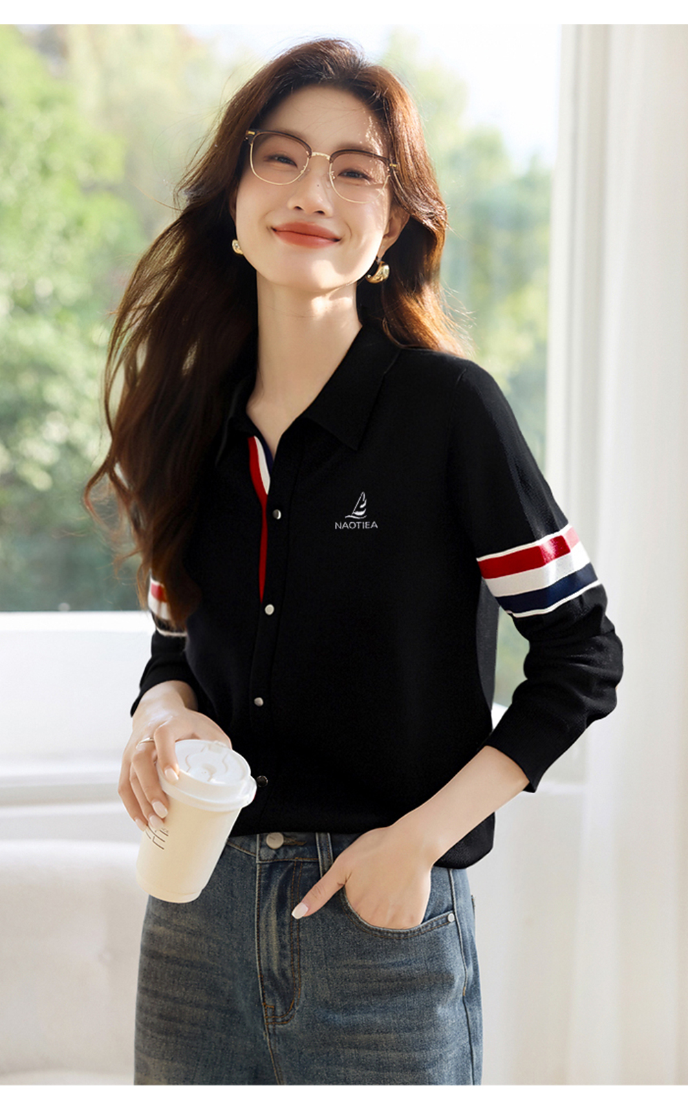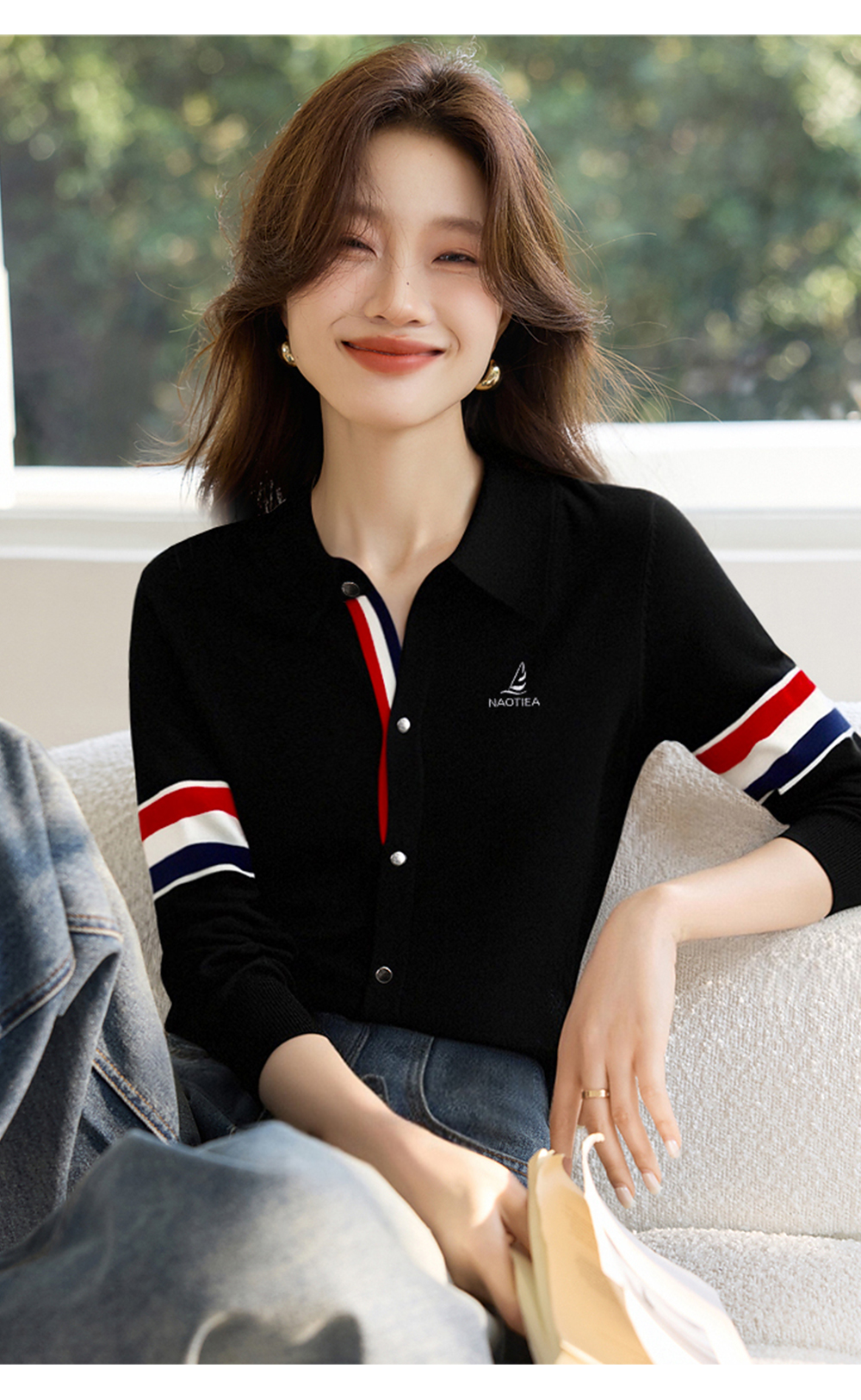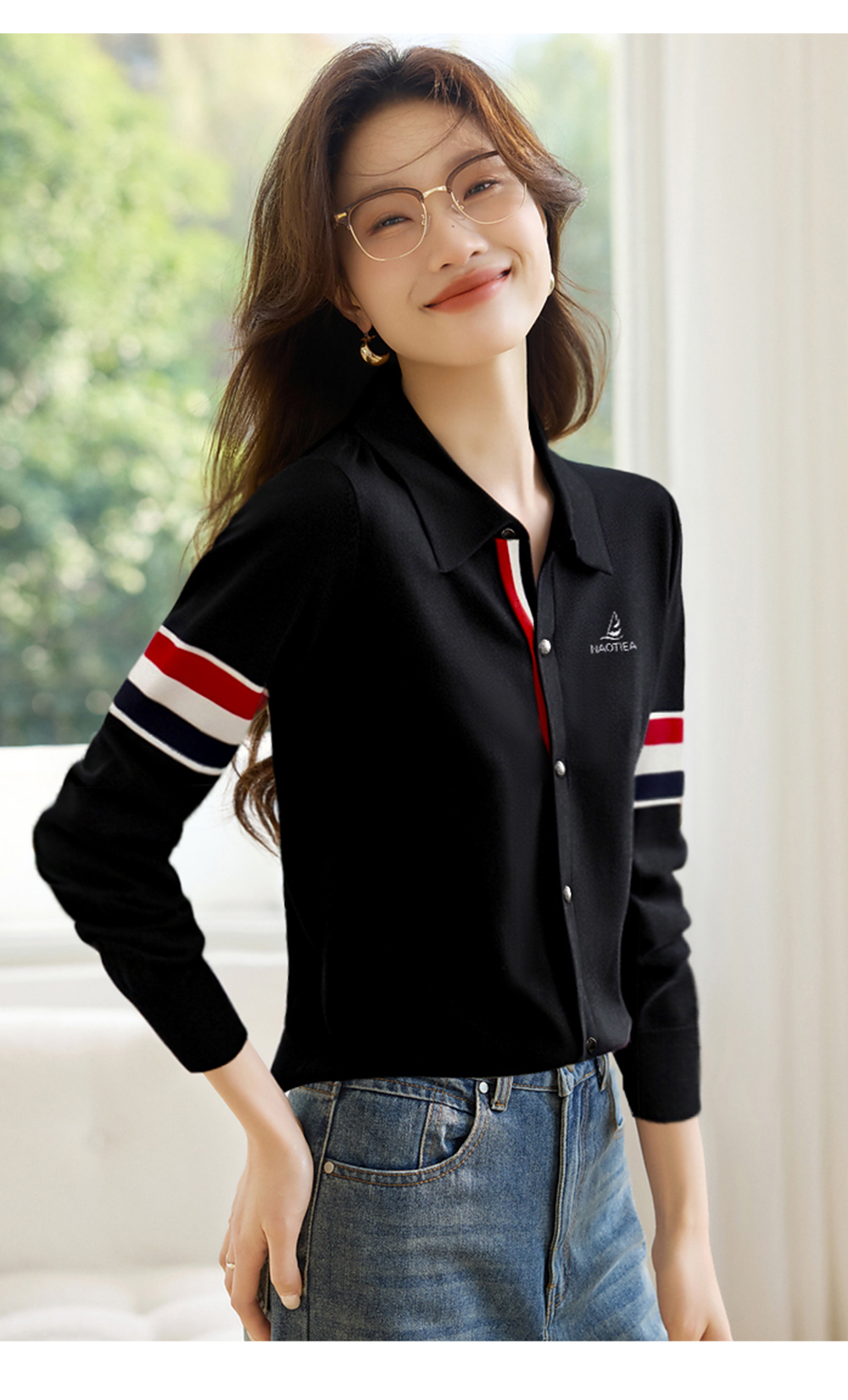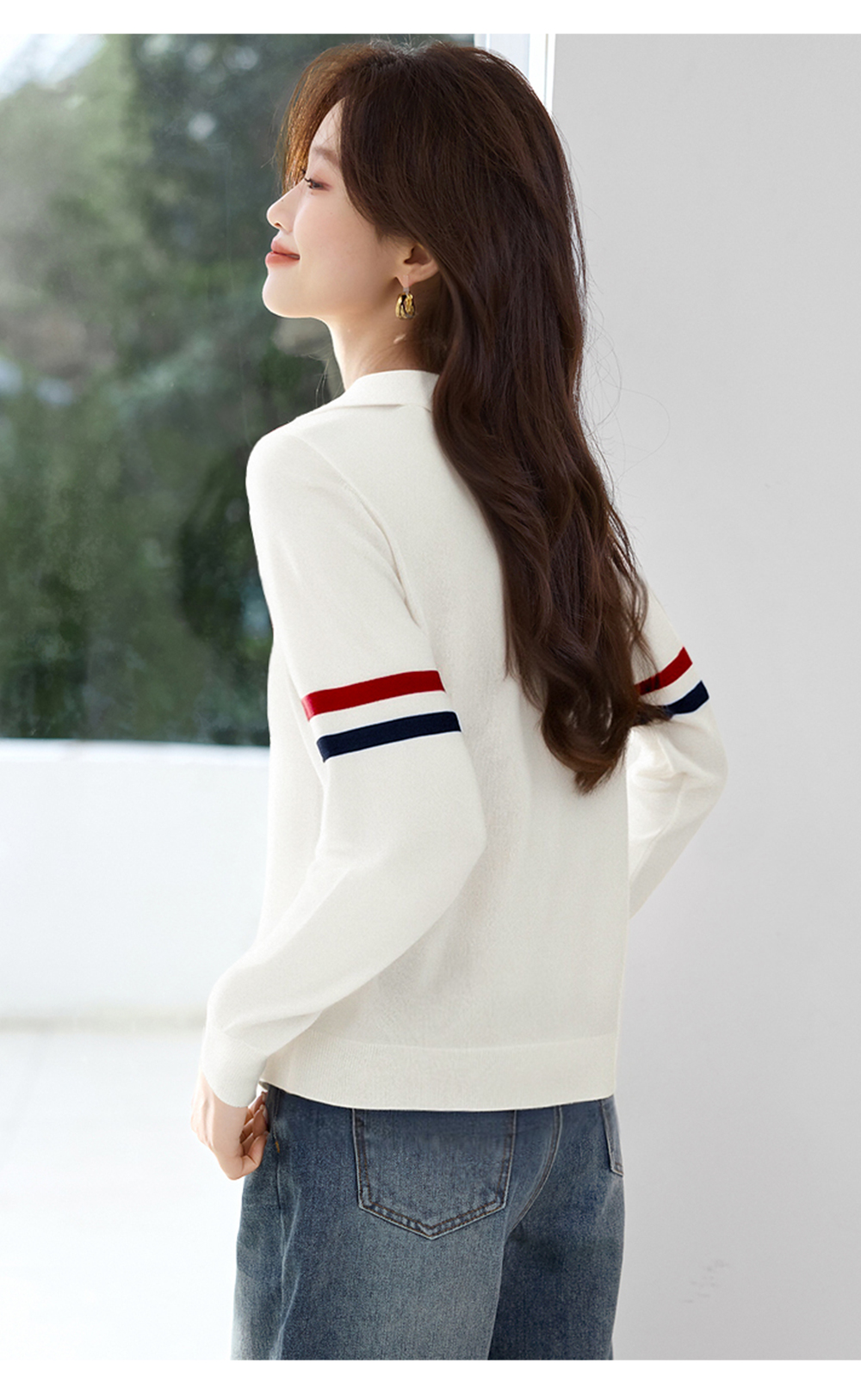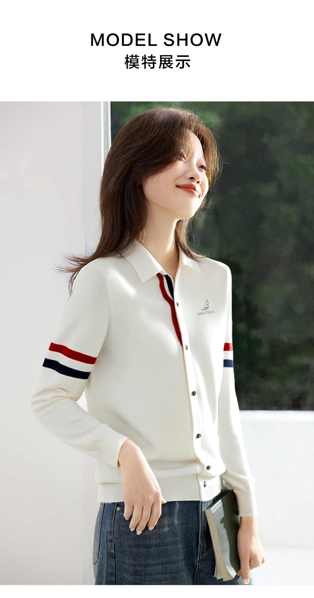 | 产品名称 : | NAOTIEA意大利小帆船白色半开POLO领长袖女2025秋英伦风针织衬衫 |