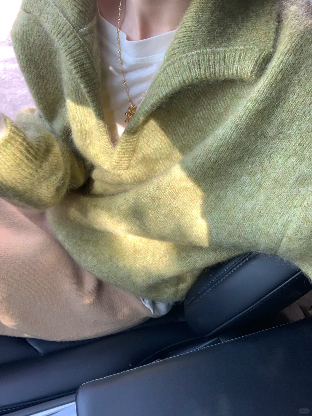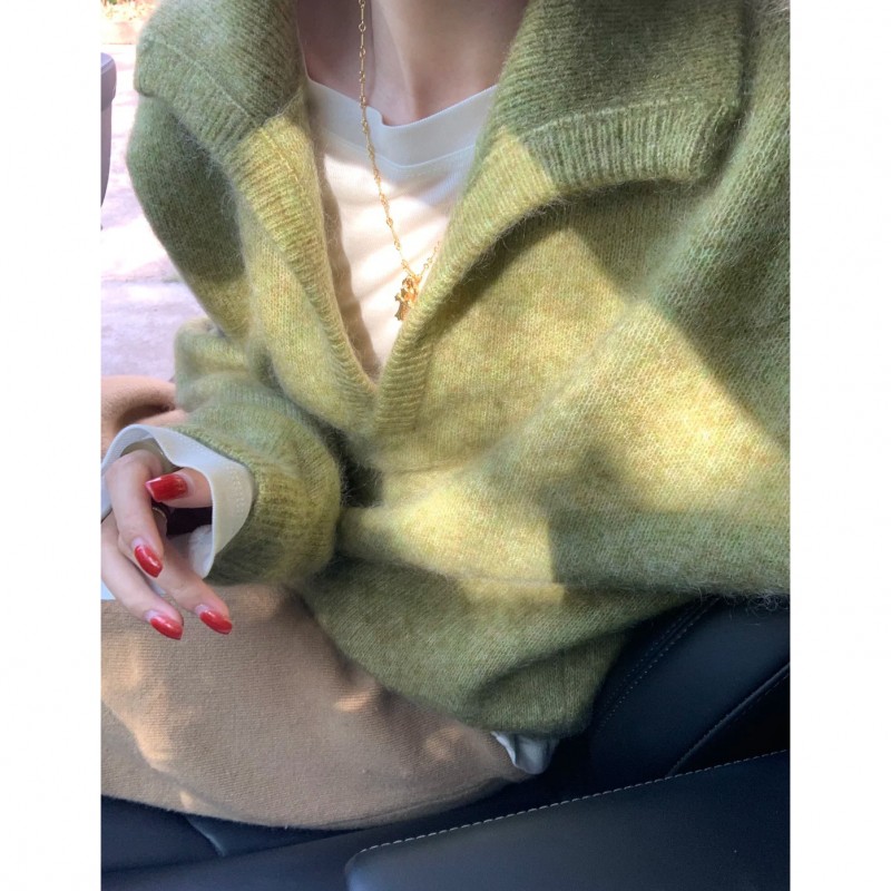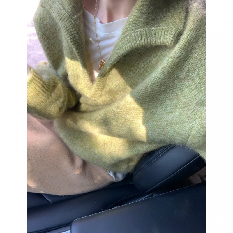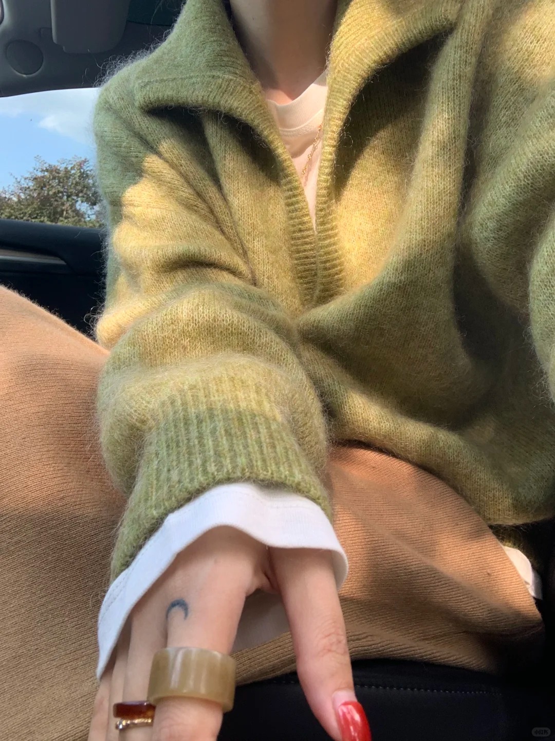 | 产品名称 : | 欧货老钱风绿色v领马海毛毛衣女秋冬慵懒高级感加厚翻领针织上衣 |