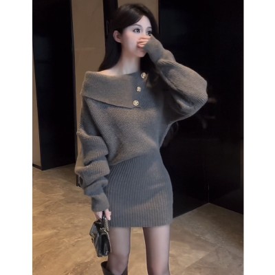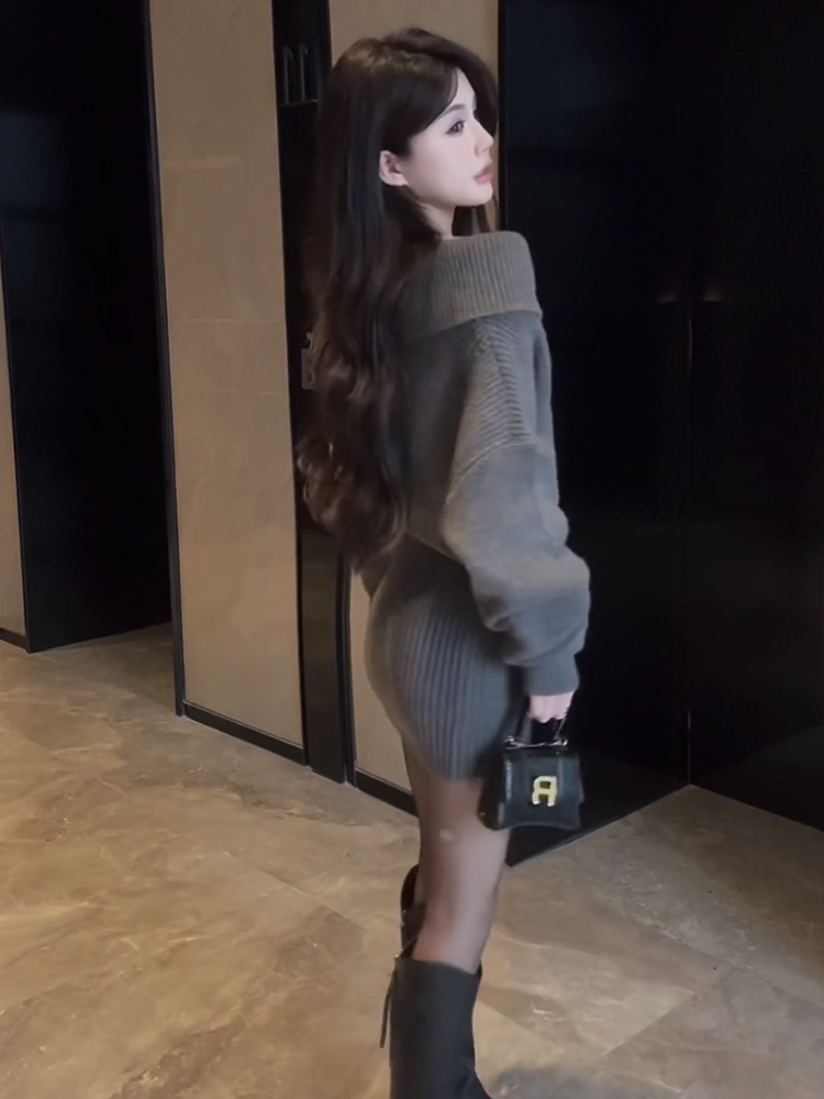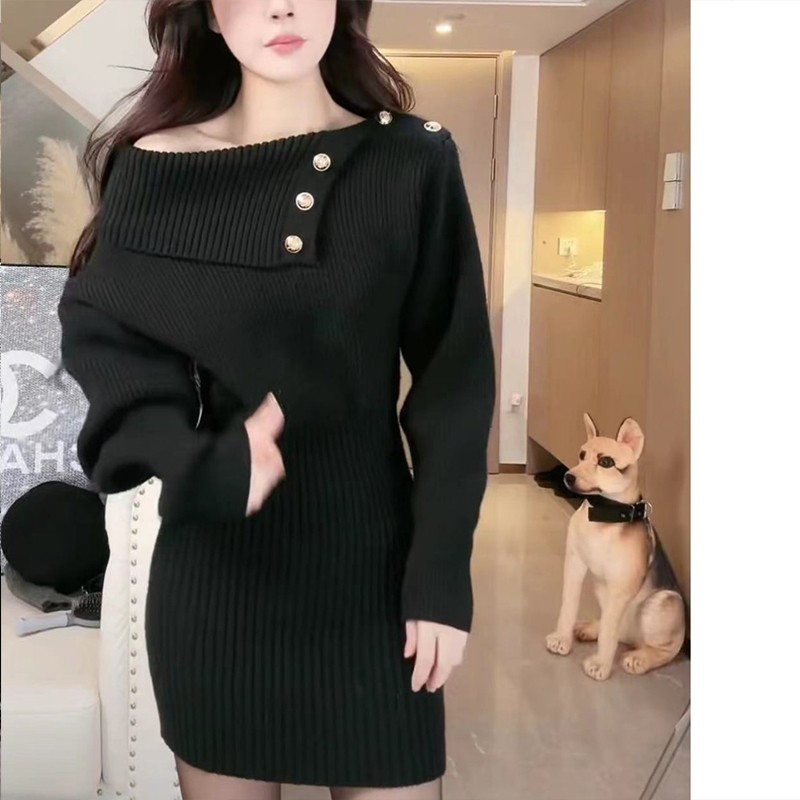 针织连衣裙女秋冬2025年新款时尚毛衣裙露肩显身材小个子包臀...