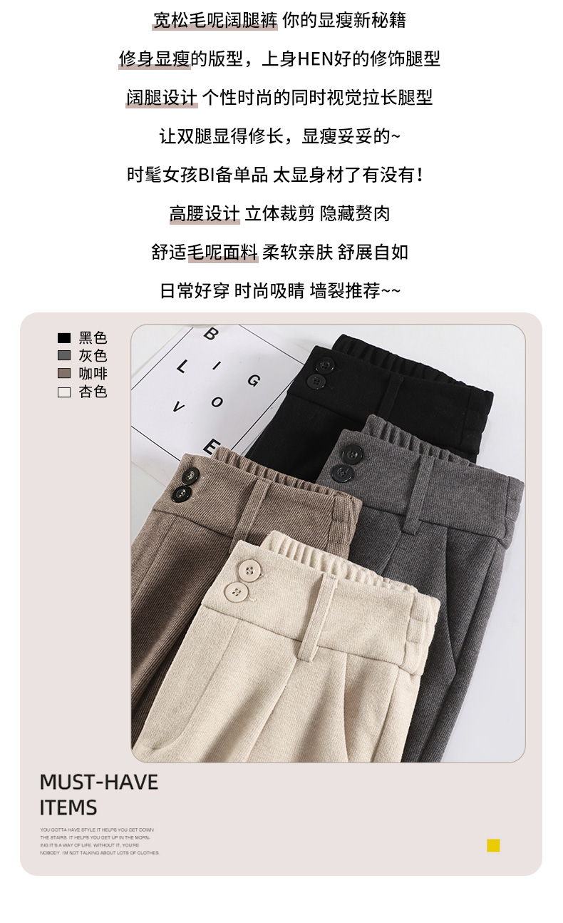 | 产品名称 : | 加绒毛呢阔腿裤女秋冬2025新款直筒宽松高腰冬季休闲裤加厚裤子女 |
