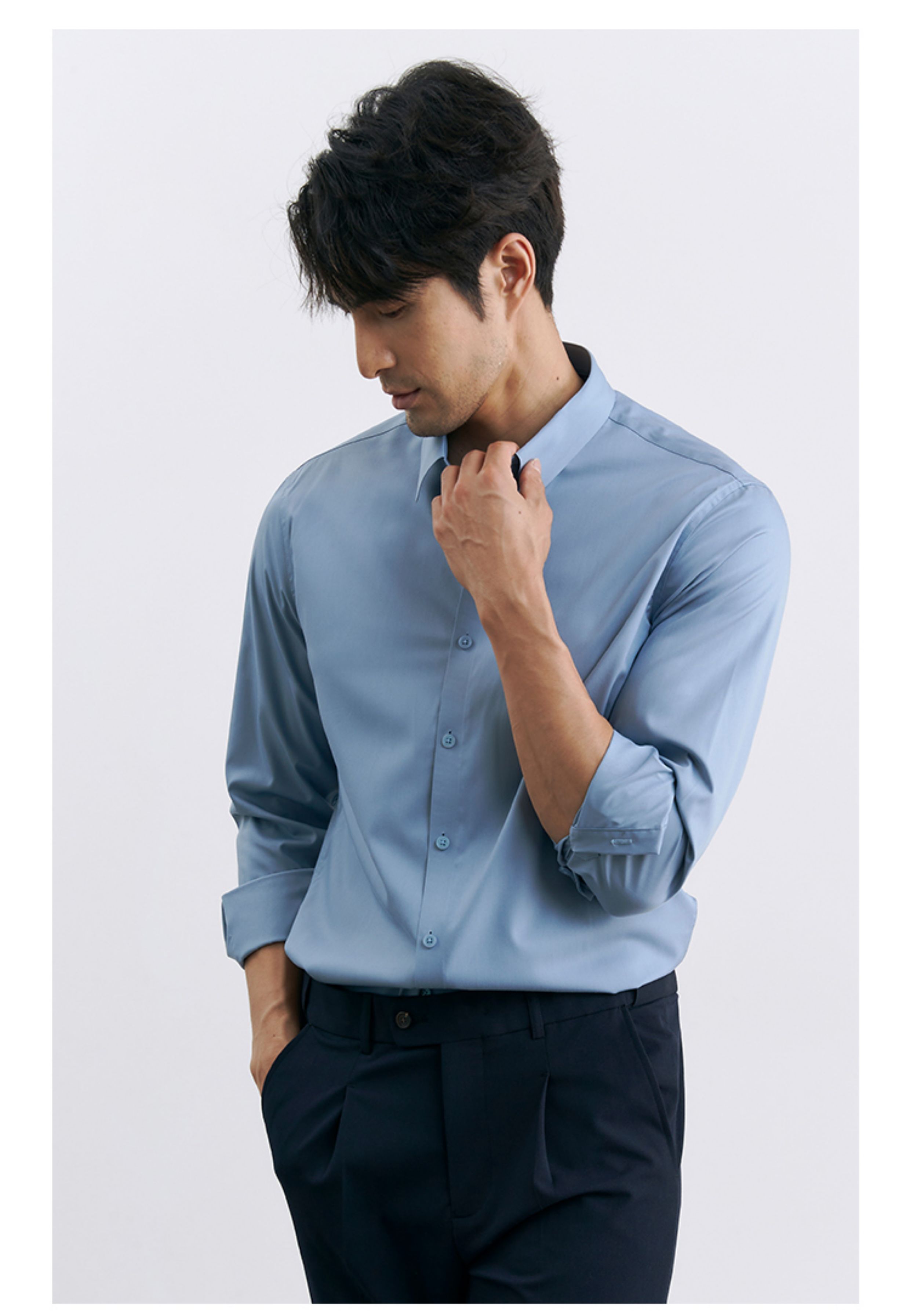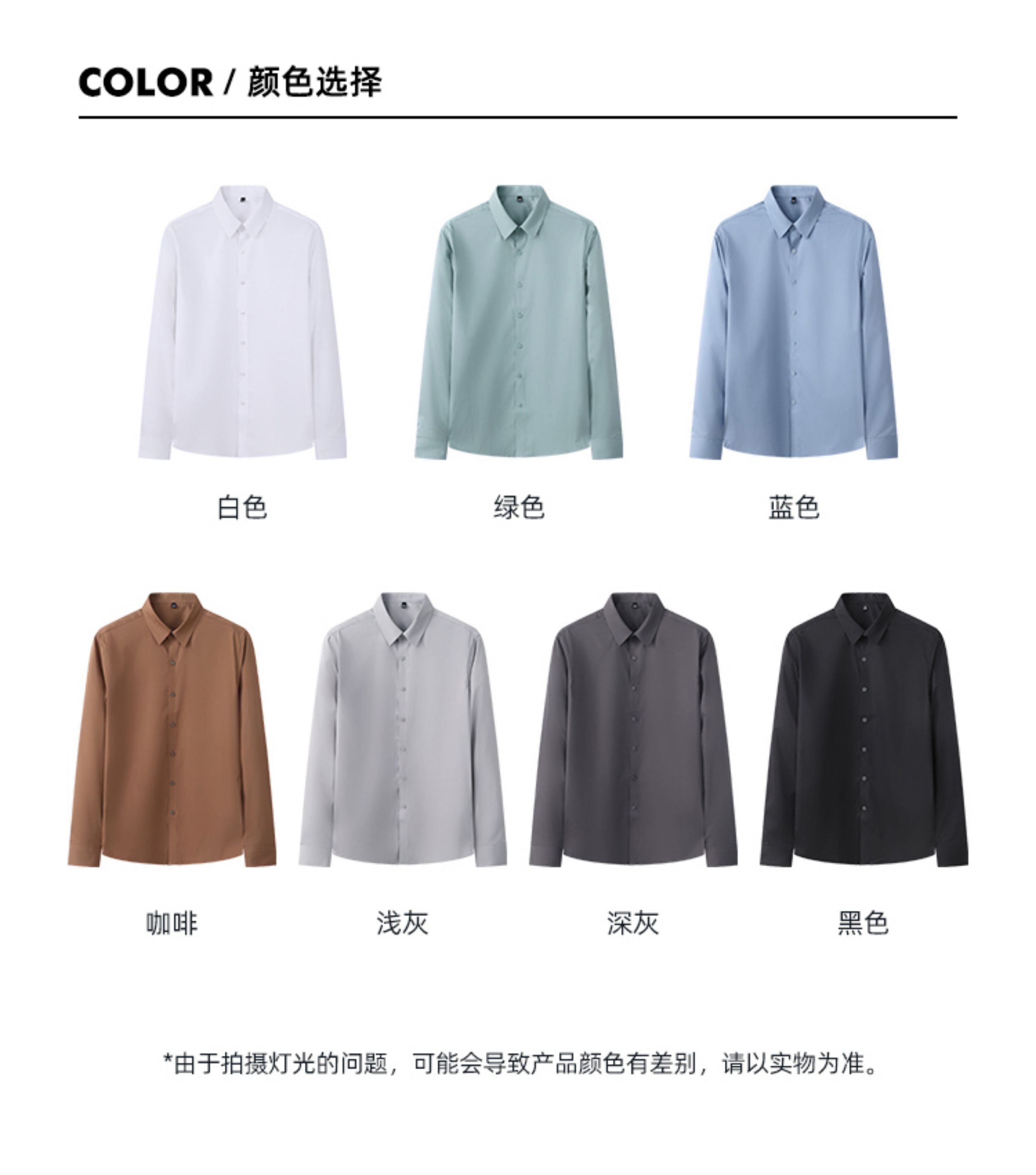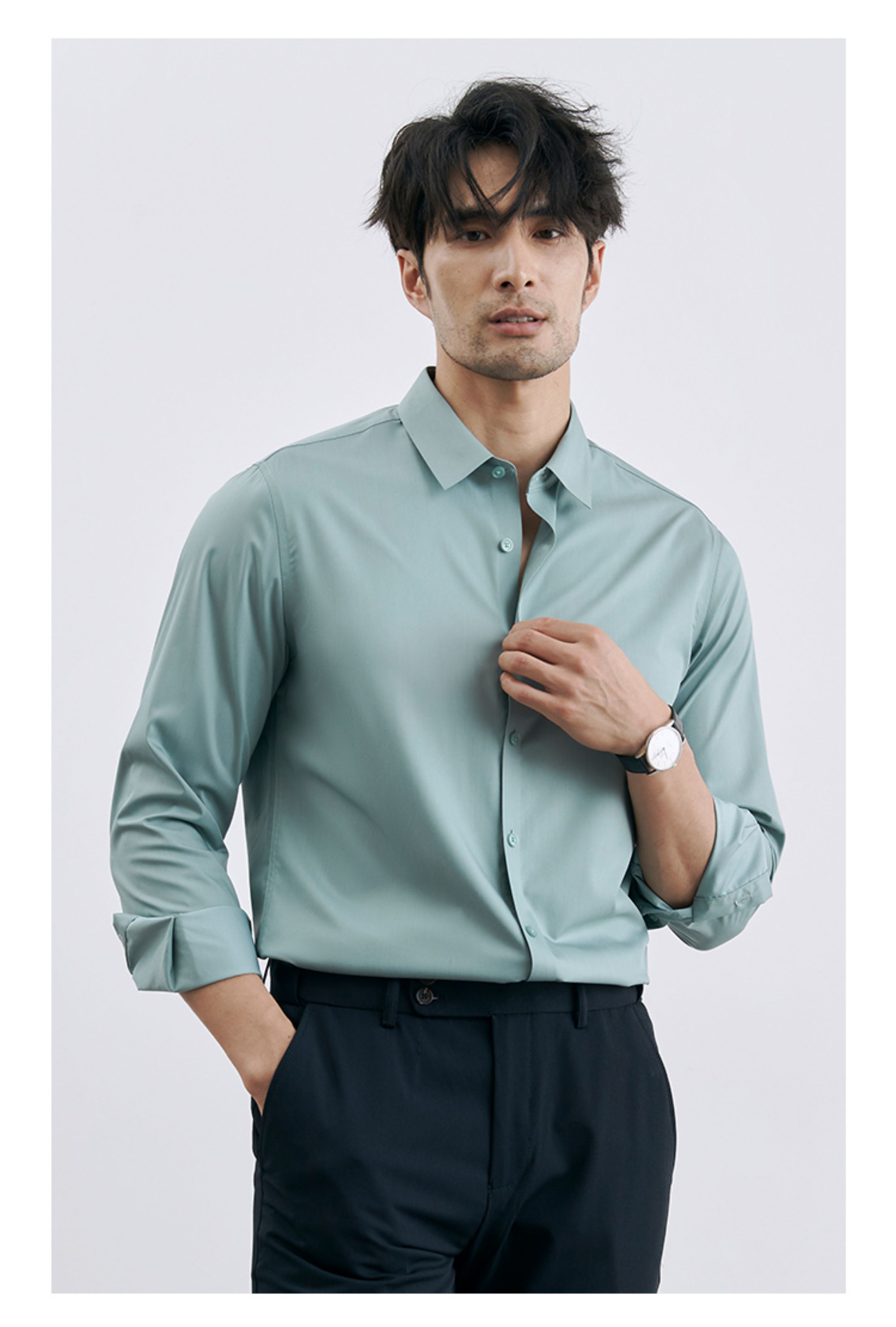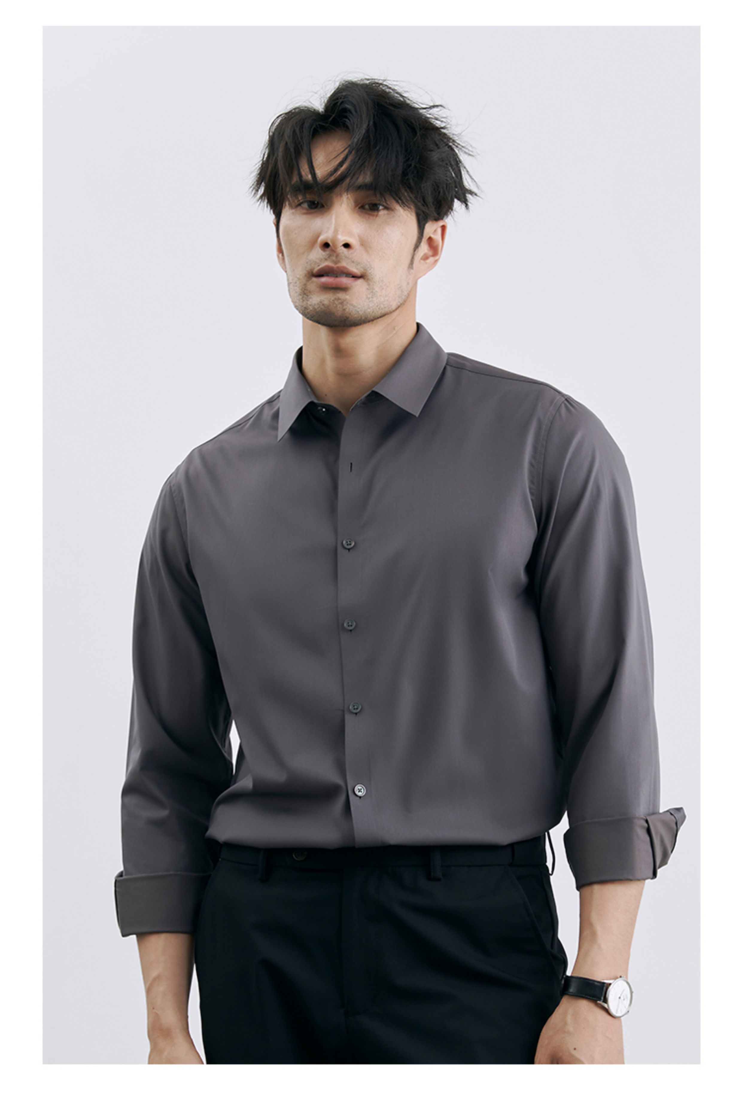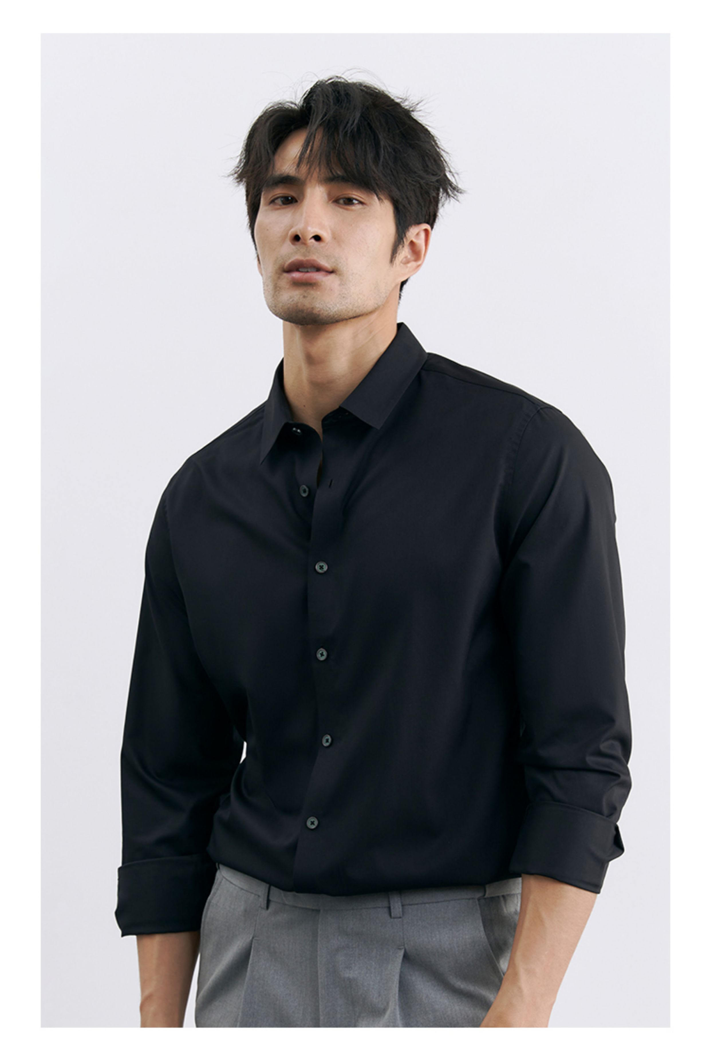 | 产品名称 : | 韩版高级感职业免烫商务正装黑衬衫男士抗皱长袖白色休闲衬衣外套 |