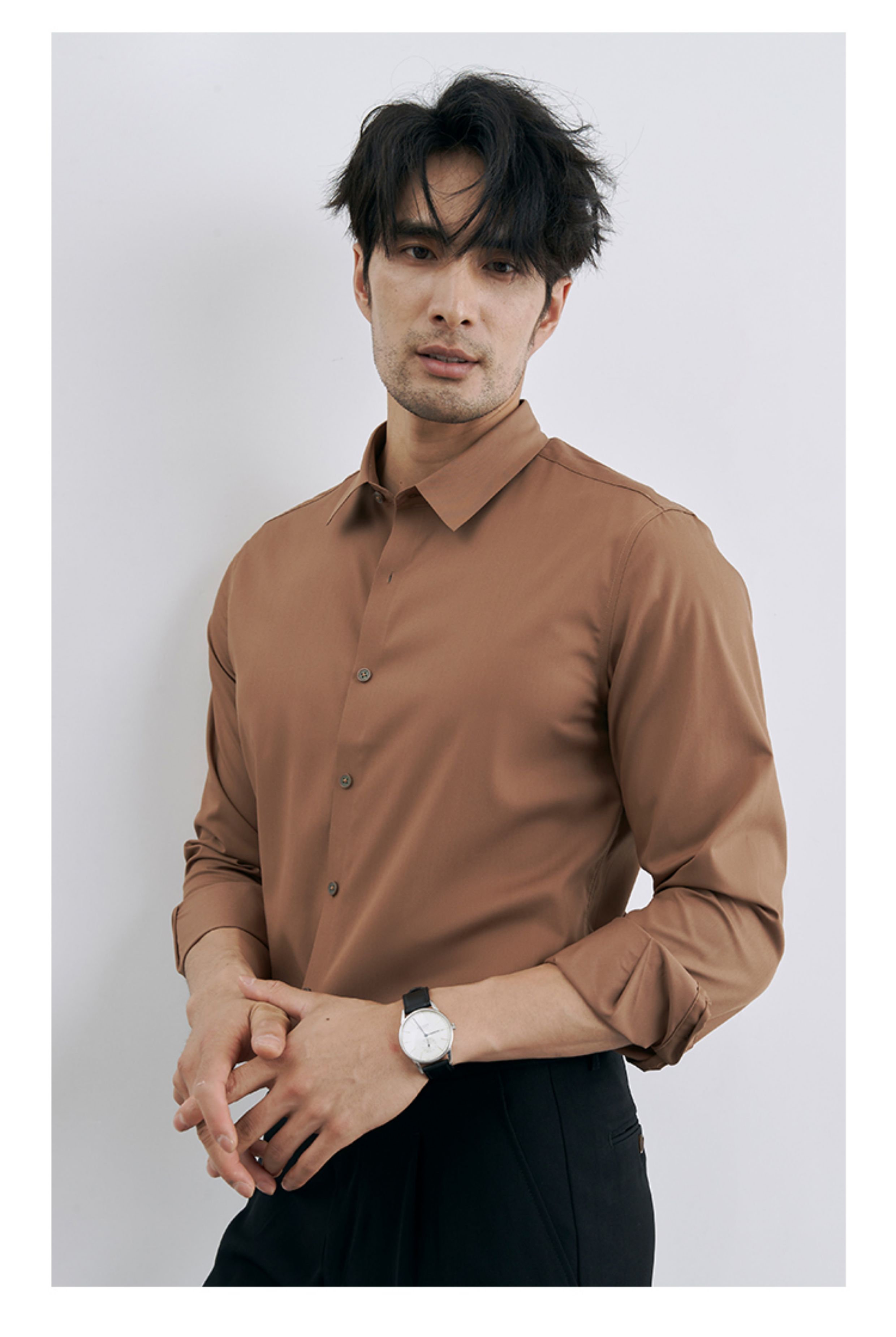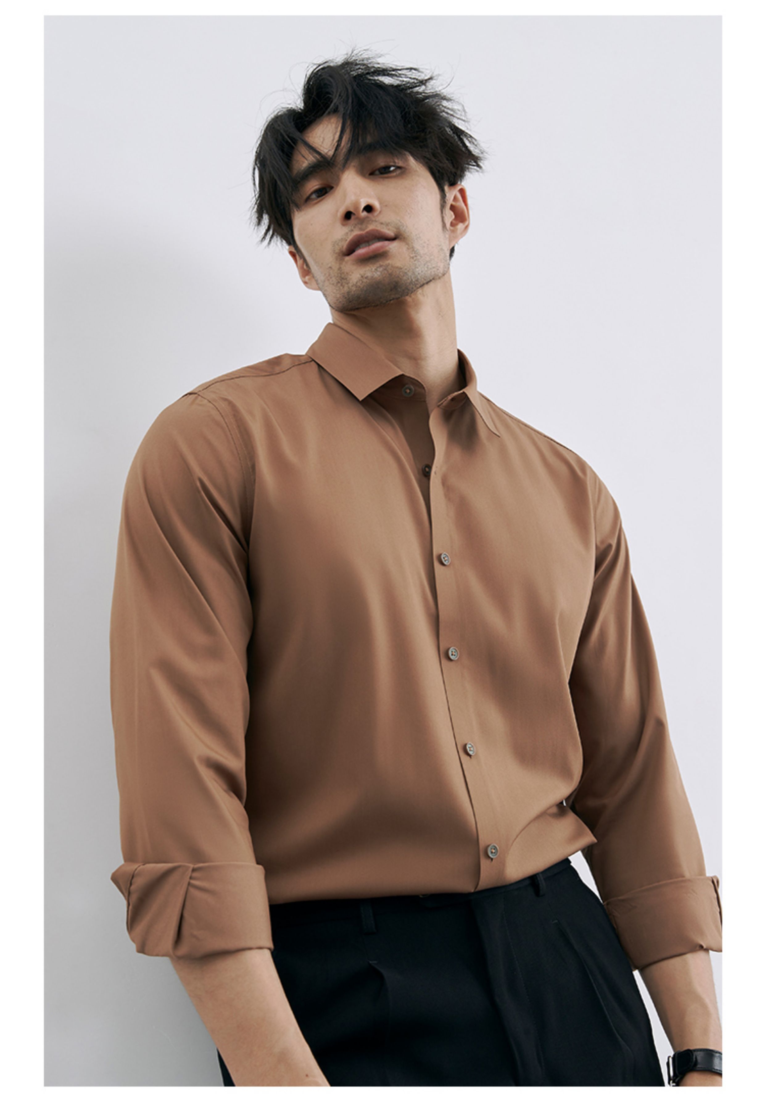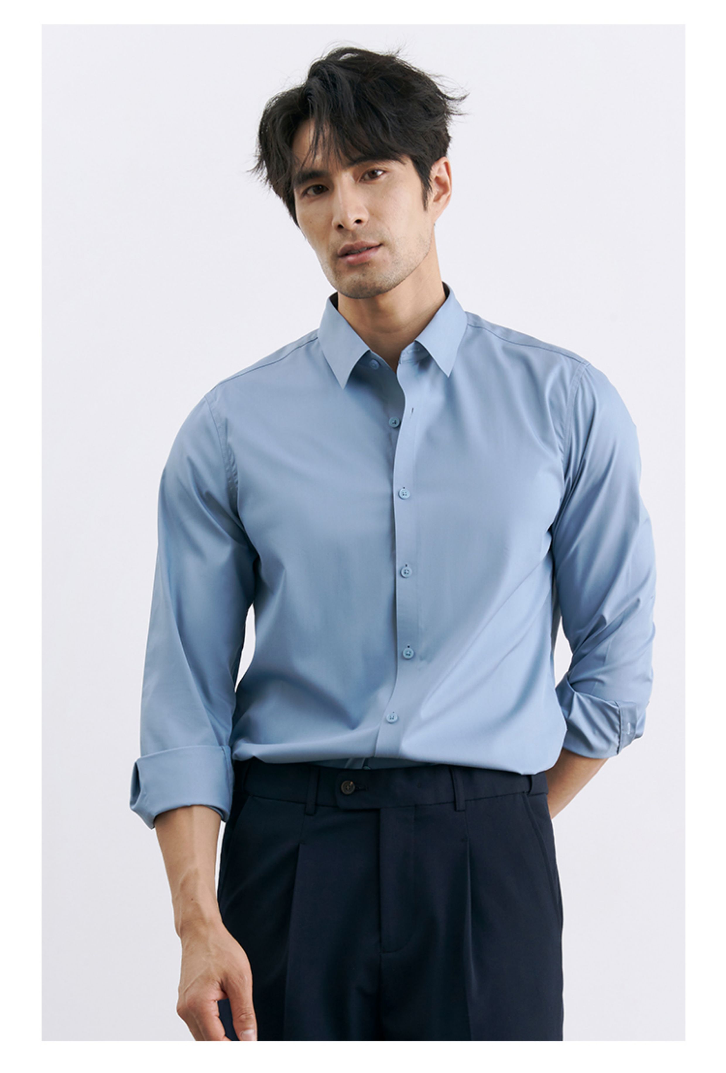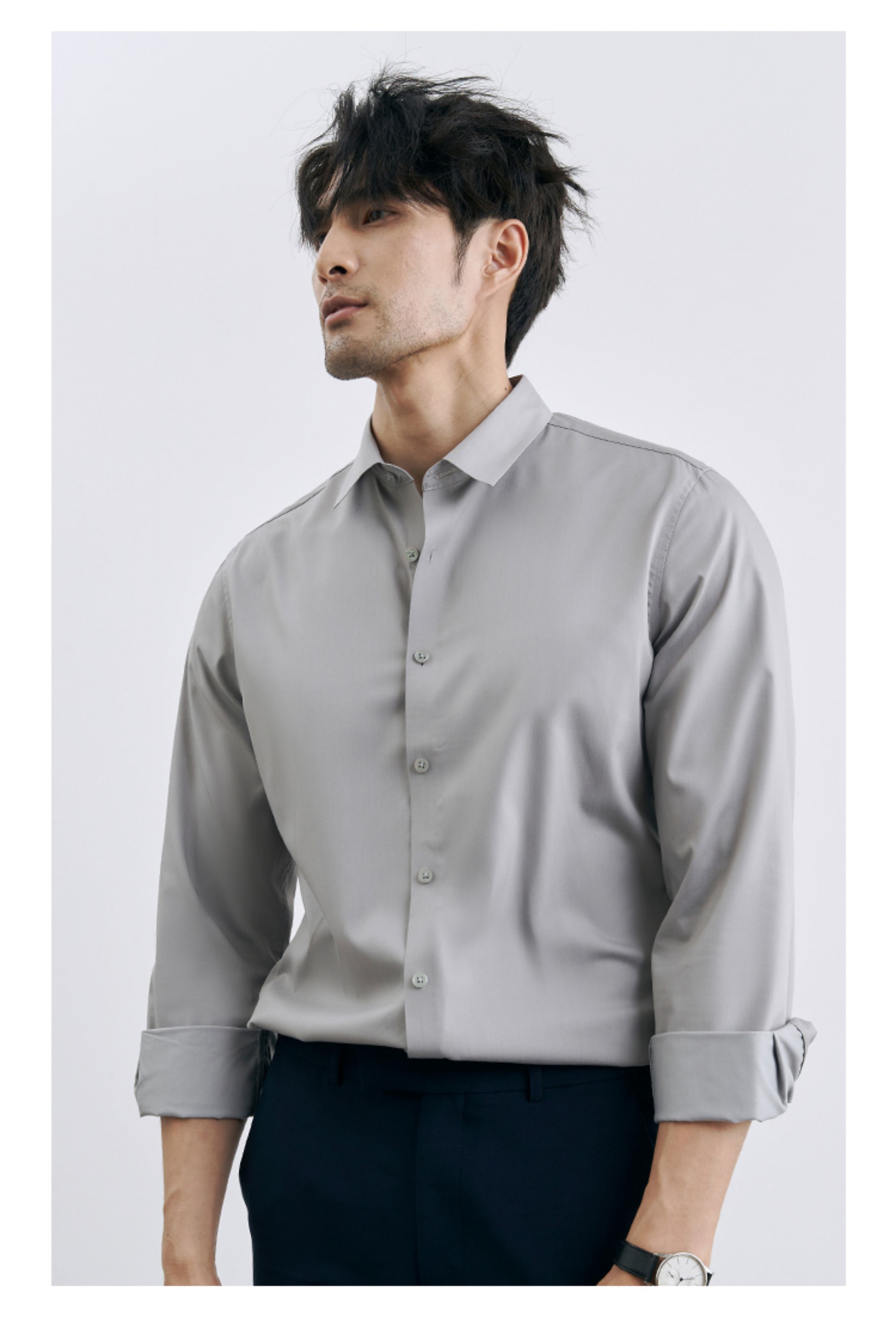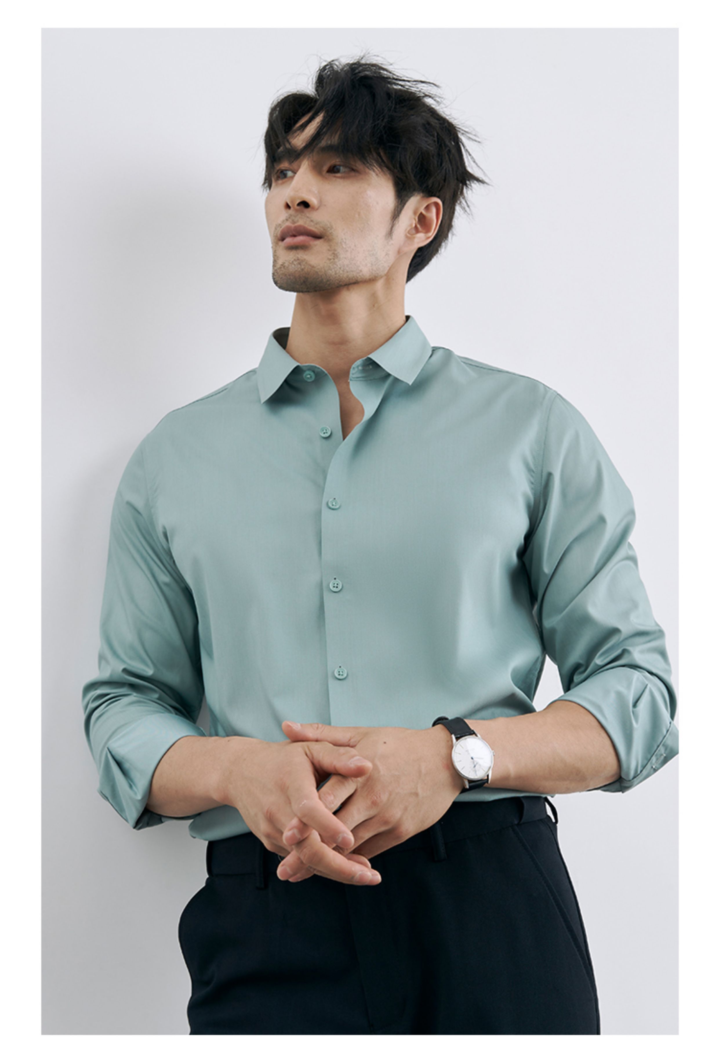 | 产品名称 : | 韩版高级感职业免烫商务正装黑衬衫男士抗皱长袖白色休闲衬衣外套 |