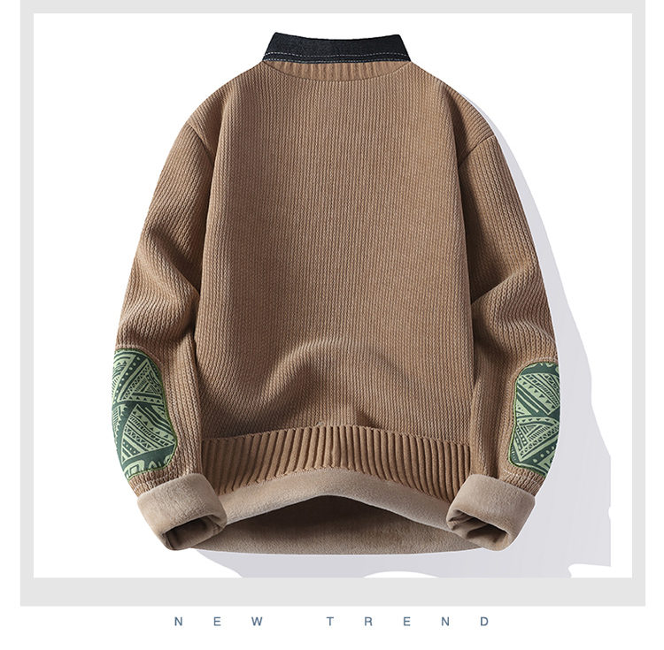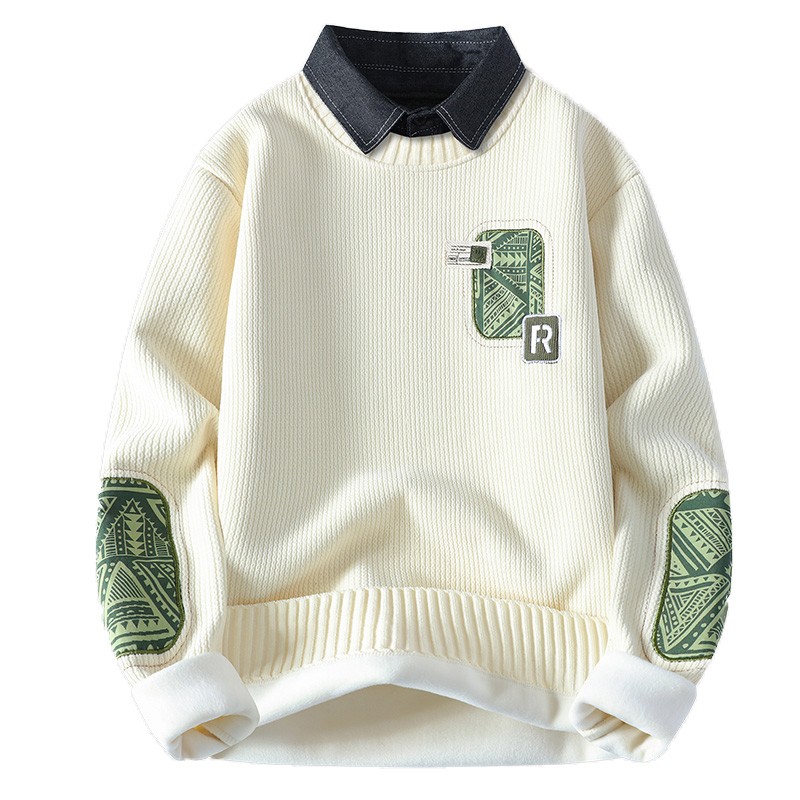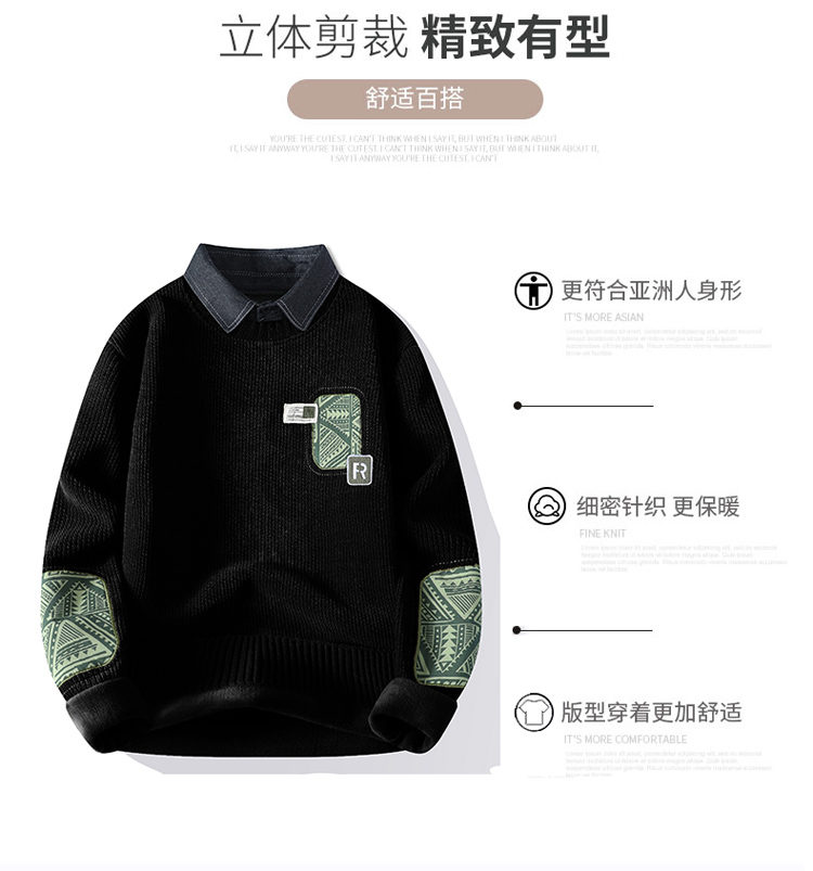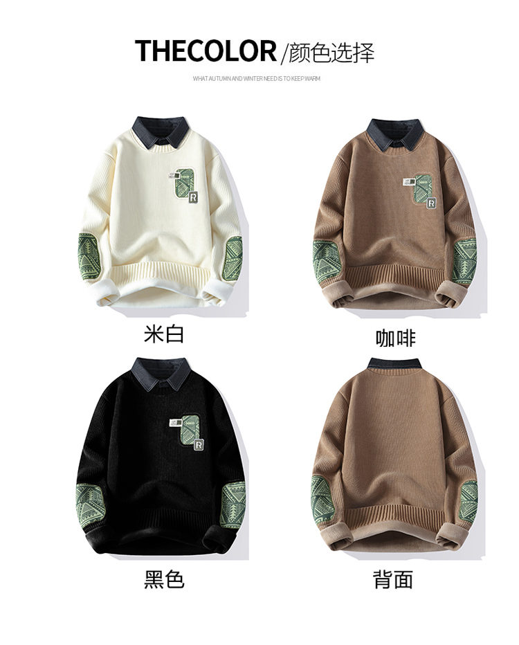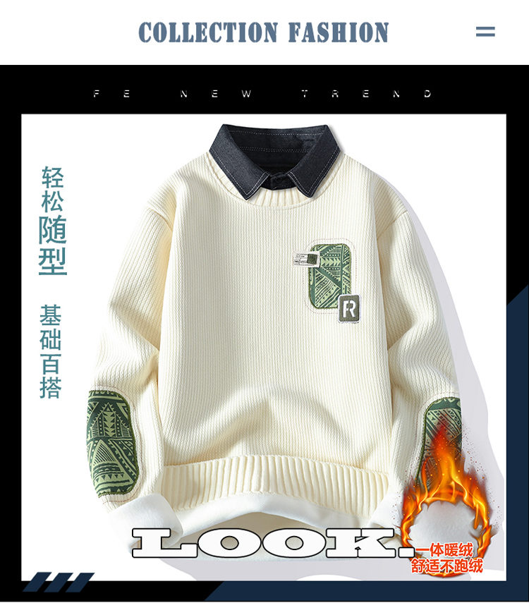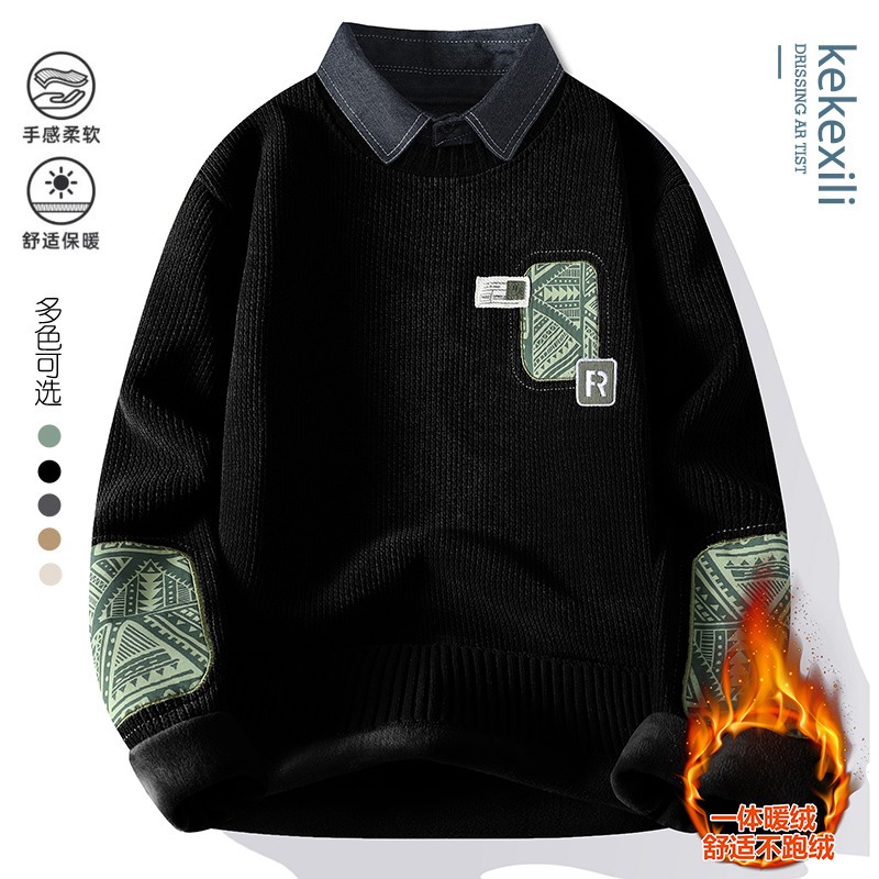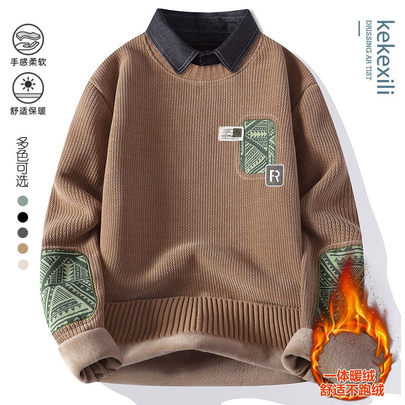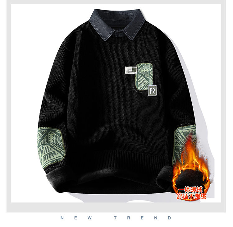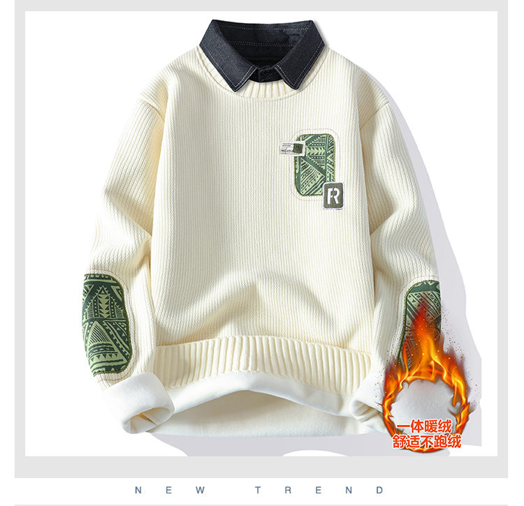 | 产品名称 : | 一体绒毛衣男秋冬季潮牌青年拼色假两件休闲保暖衬衫领针织衫内衣 |