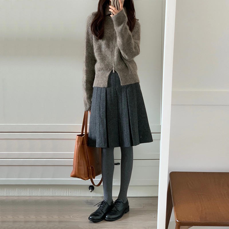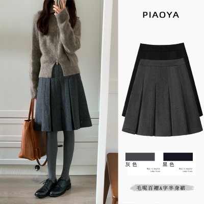 产品名称 : 灰色毛呢百褶裙女秋冬新款高腰韩版中裙高级感通勤显瘦a字半身裙
