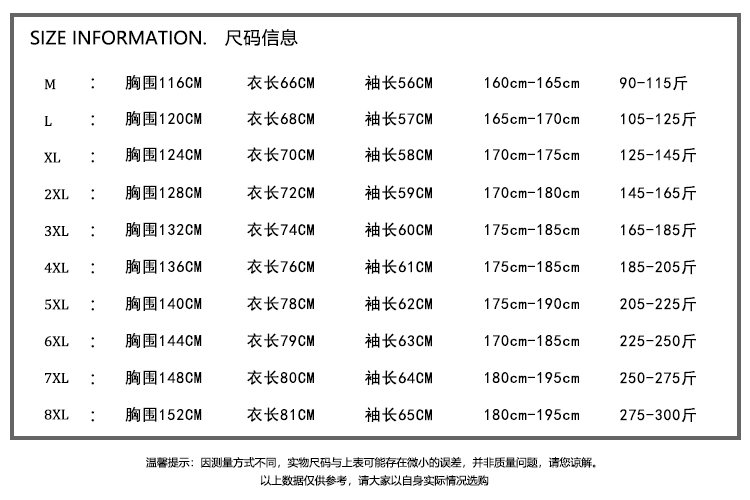 | 尺码: | 3XL 2XL S M L XL 4XL 5XL 6XL 7XL 8XL |