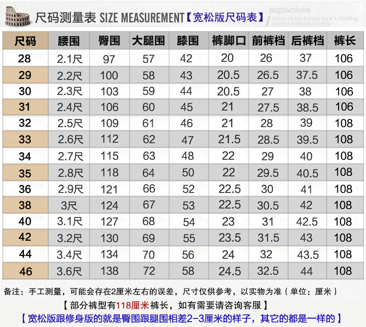 | 尺码: | 28码【2.1尺腰围】,29码【2.2尺腰围】,30码【2.3尺腰围】,31码【2.4尺腰围】,32码【2.5尺腰围】,33码【2.6尺腰围】,34码【2.7尺腰围】,35码【2.8尺腰围】,36码【2.9尺腰围】,38码【3.尺腰围】,40码【3.1尺腰围】,42码【3.2尺腰围】,44码【3.4尺腰围】,46码【3.6尺腰围】 |