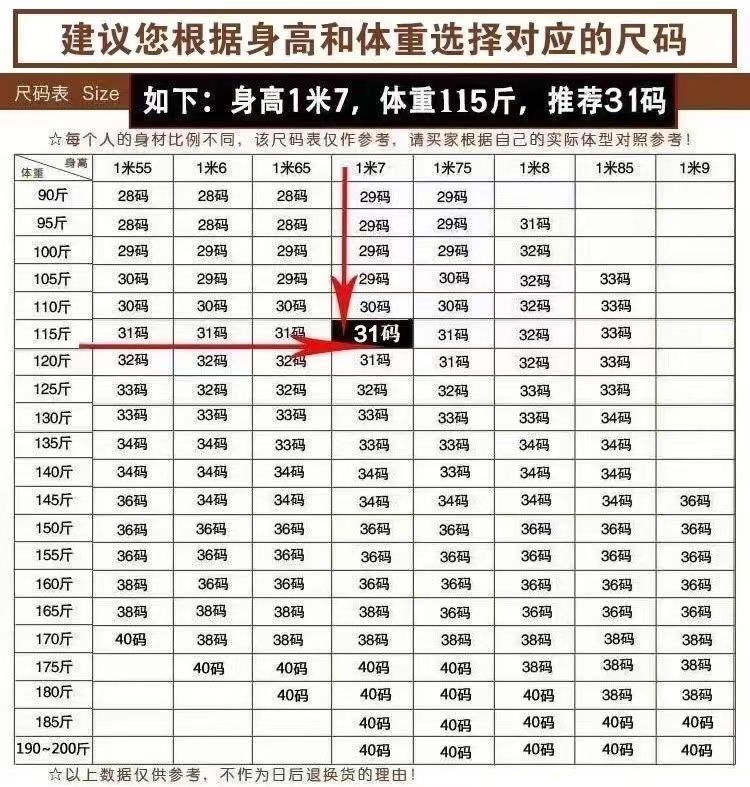 | 尺码: | 28码【腰围2尺1】90-100斤,29码【腰围2尺2】100-105斤,30码【腰围2尺3】105-115斤,31码【腰围2尺4】115-120斤,32码【腰围2尺5】120-130斤,33码【腰围2尺6】130-140斤,34码【腰围2尺7】140-155斤,36码【腰围2尺8】155-165斤,38码【腰围2尺9】165-180斤,40码【腰围3尺】180-200斤 |