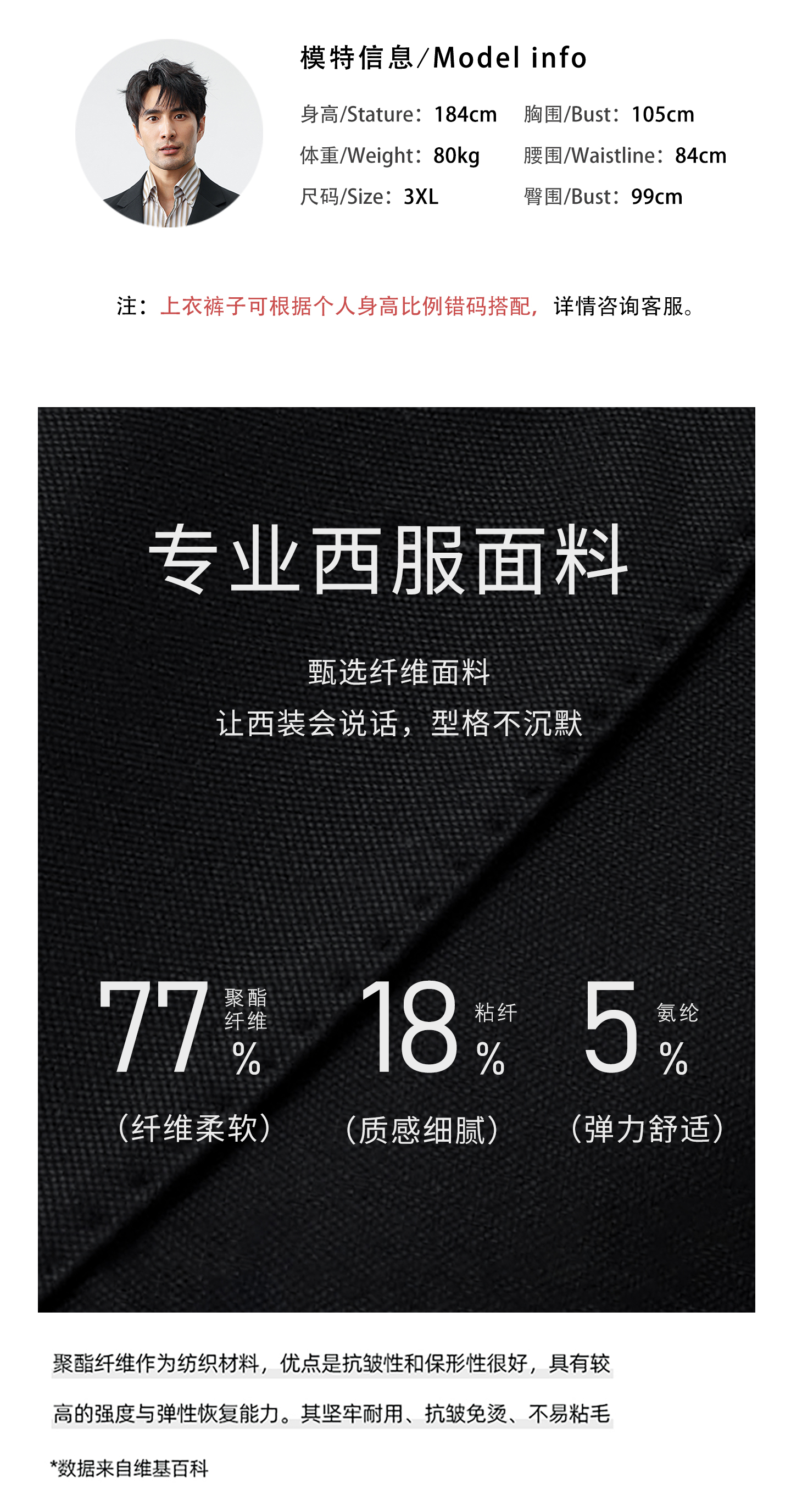 | 材质成分: | 聚酯纤维77% 粘胶纤维(粘纤)18% 聚氨酯弹性纤维(氨纶)5% |