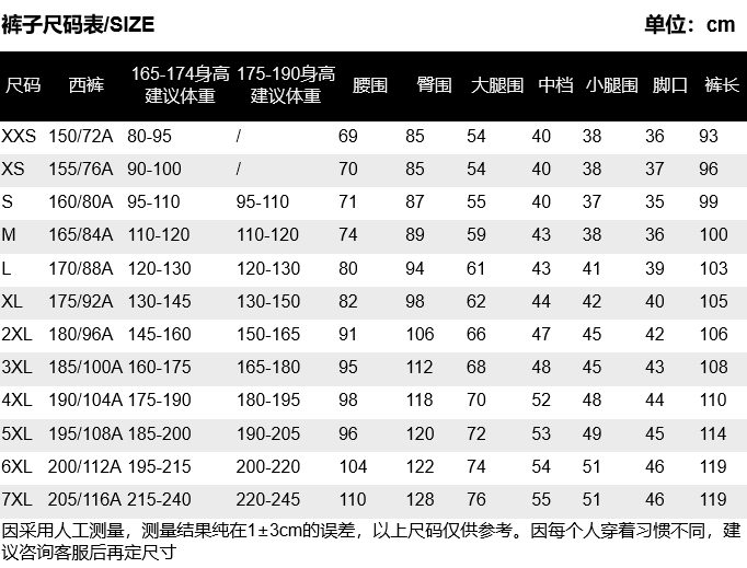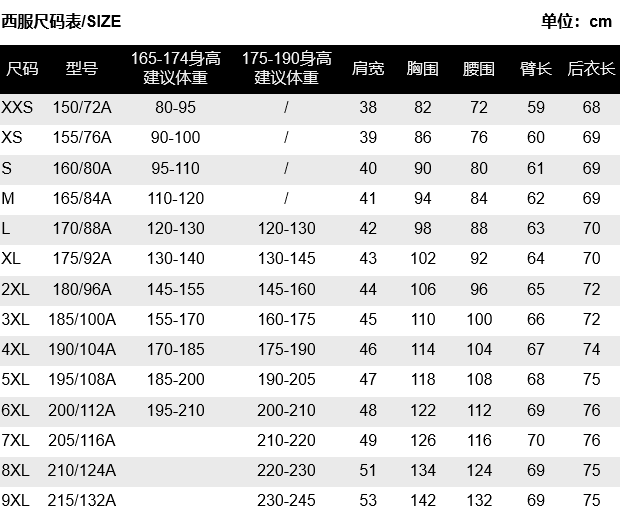 XXS(80-95斤),XS(90-100斤),S(95-110斤),M(110-118斤),L(118-128斤),XL(128-138斤),2XL(138-160斤),3XL(160-175斤),4XL(175-190斤),5XL(185-200斤),6XL(195-215),7XL(215-240斤),8XL(240-260斤) |