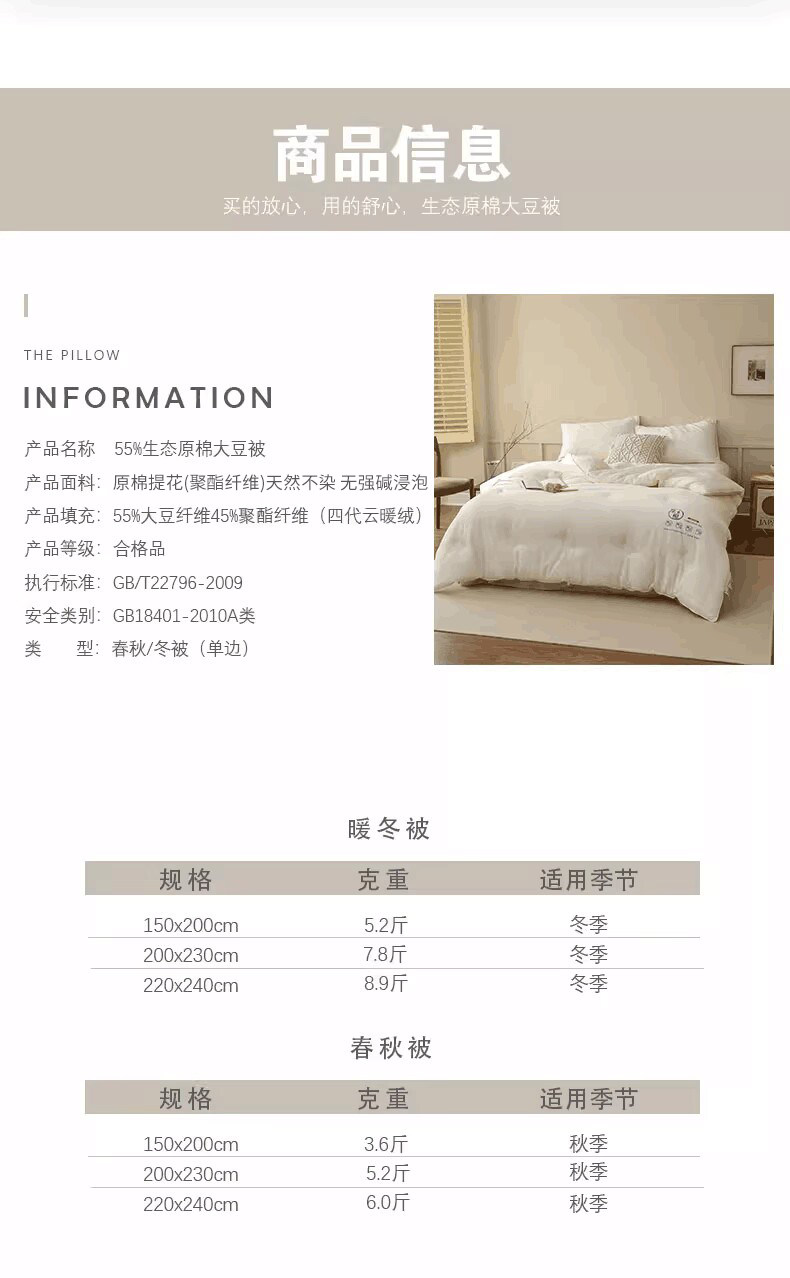 | 颜色分类: | 生态原棉大豆被-白色【55%大豆纤维丨無印正品】 生态原棉大豆被-灰色【55%大豆纤维丨無印正品】 生态原棉大豆被-粉色【55%大豆纤维丨無印正品】 A类贴布大豆被-白色【51%大豆纤维丨無印正品】 A类贴布大豆被-灰色【51%大豆纤维丨無印正品】 A类贴布大豆被-蓝色【51%大豆纤维丨無印正品】 【⭐认准国家补贴 千万别买无国补劣质产品❗】 国标双A类质检 拒绝黑心棉 有证书才放心!! |