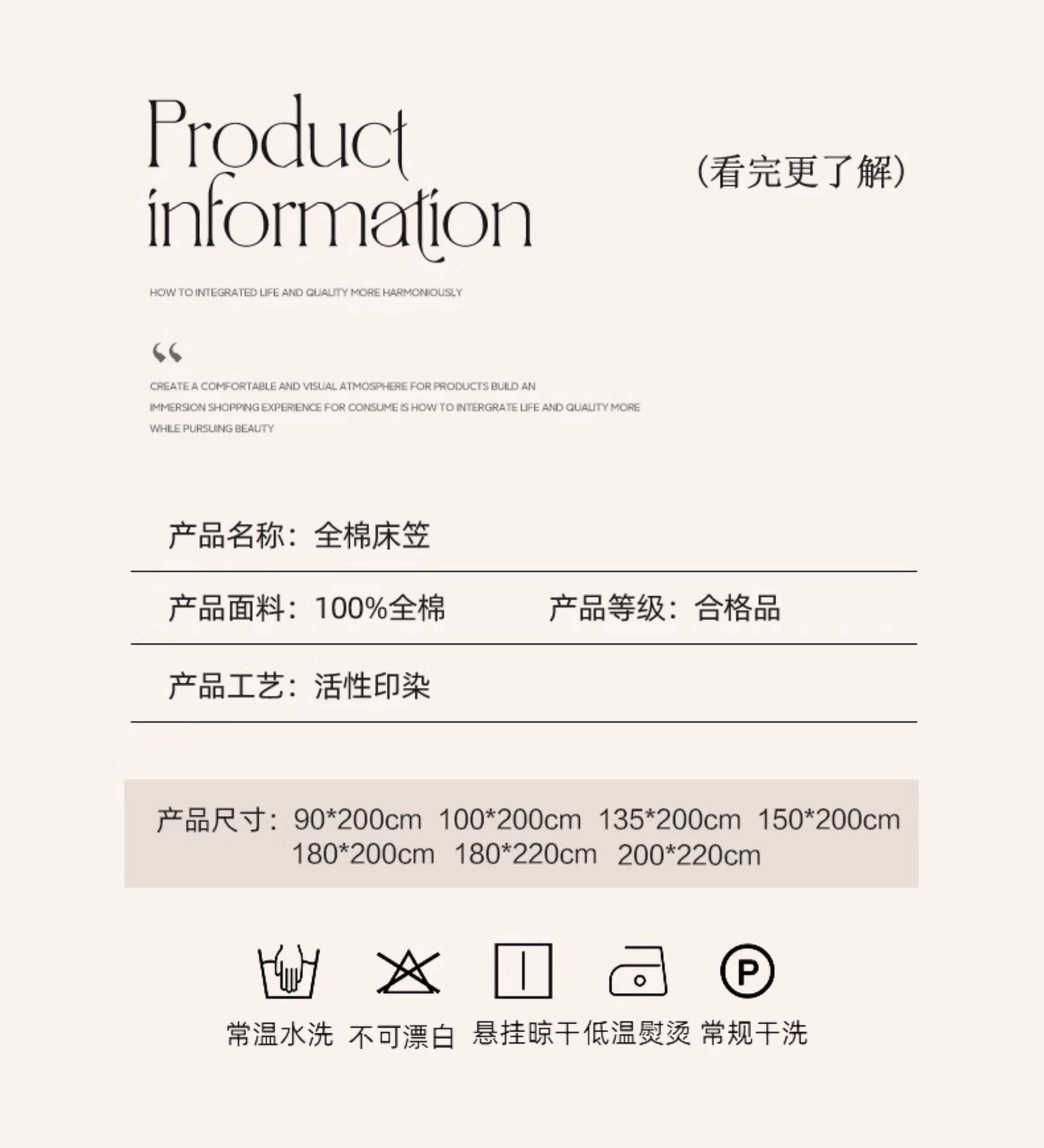 | 床单/床笠尺寸: | 90*200cm床笠单件【适合5~25cm床垫】 100*200cm床笠单件【适合5~25cm床垫】 120*200cm床笠单件【适合5~25cm床垫】 135*200cm床笠单件【适合5~25cm床垫】 150*200cm床笠单件【适合5~25cm床垫】 180*200cm床笠单件【适合5~25cm床垫】 180*220cm床笠单件【适合5~25cm床垫】 200*220cm床笠单件【适合5~25cm床垫】 床笠两件套:90*200cm床笠+枕套一只 床笠两件套:100*200cm床笠+枕套一只 床笠两件套:120*200cm床笠+枕套一只 床笠两件套:135*200cm床笠+枕套一只 床笠三件套:150*200cm床笠+枕套一对 床笠三件套:180*200cm床笠+枕套一对 床笠三件套:180*220cm床笠+枕套一对 床笠三件套:200*220cm床笠+枕套一对 |