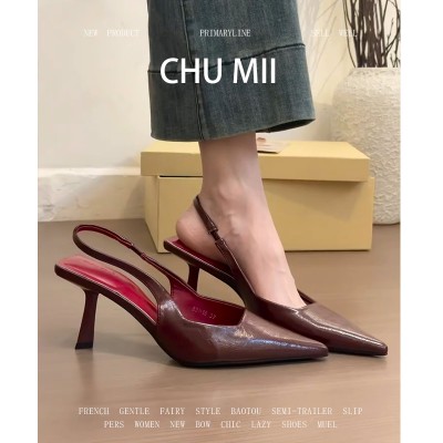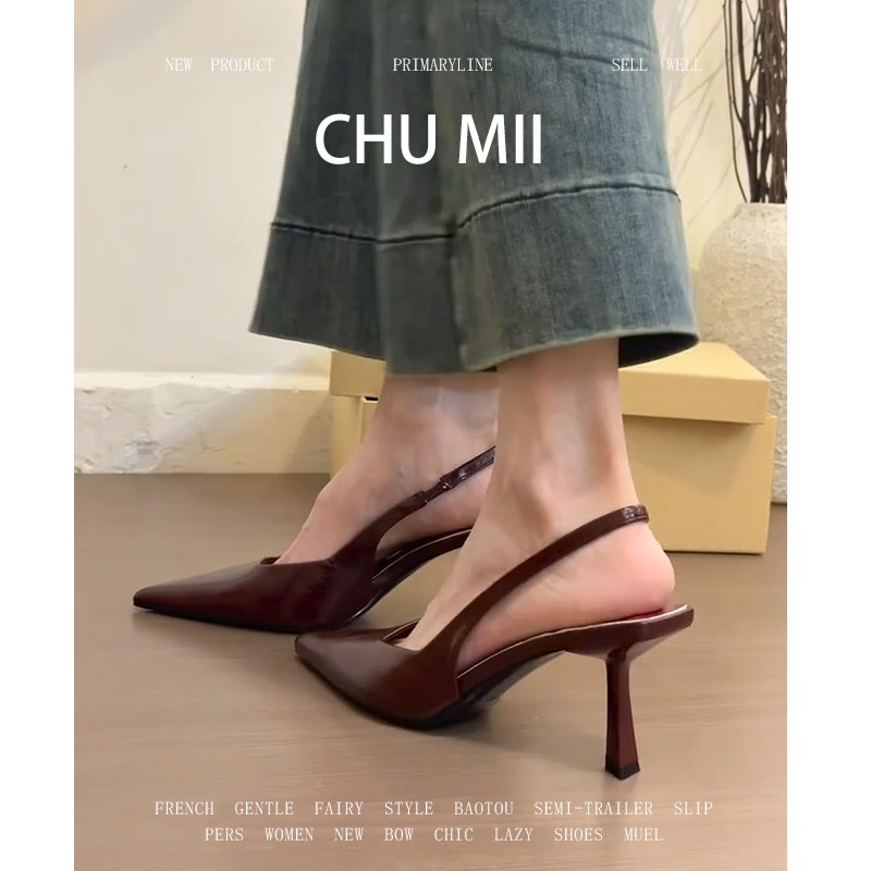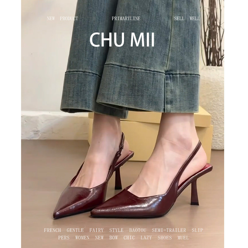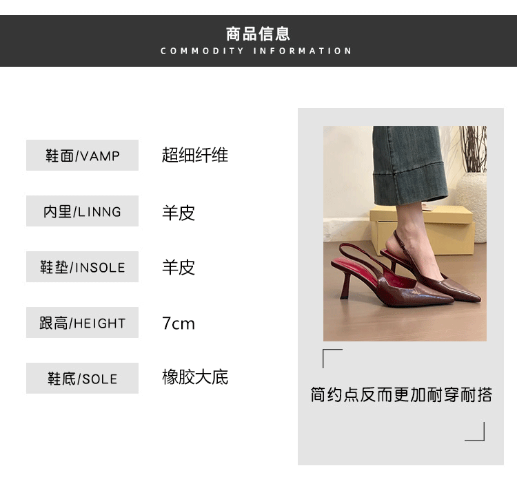 羊皮版~法式酒红尖头高跟鞋女复古气质细跟包头凉鞋配裙子单鞋