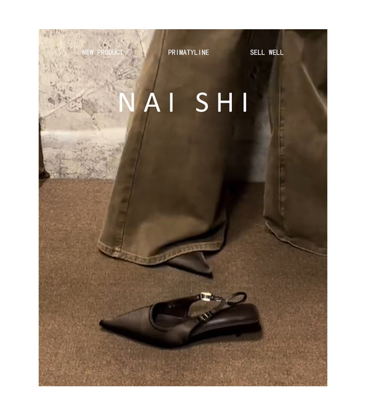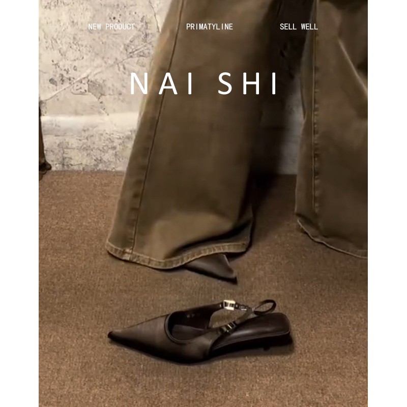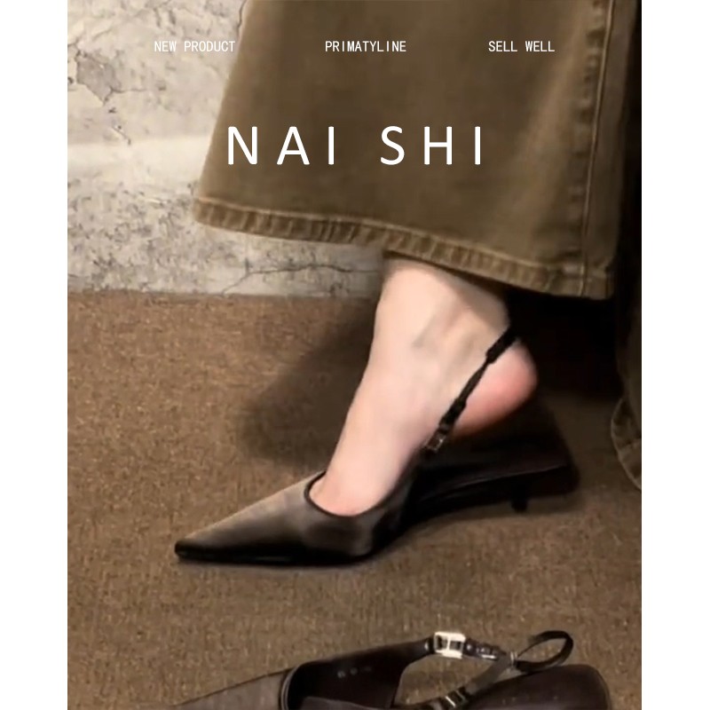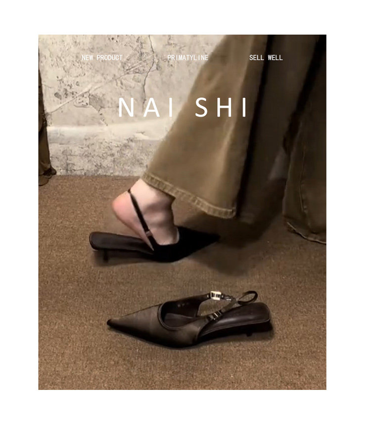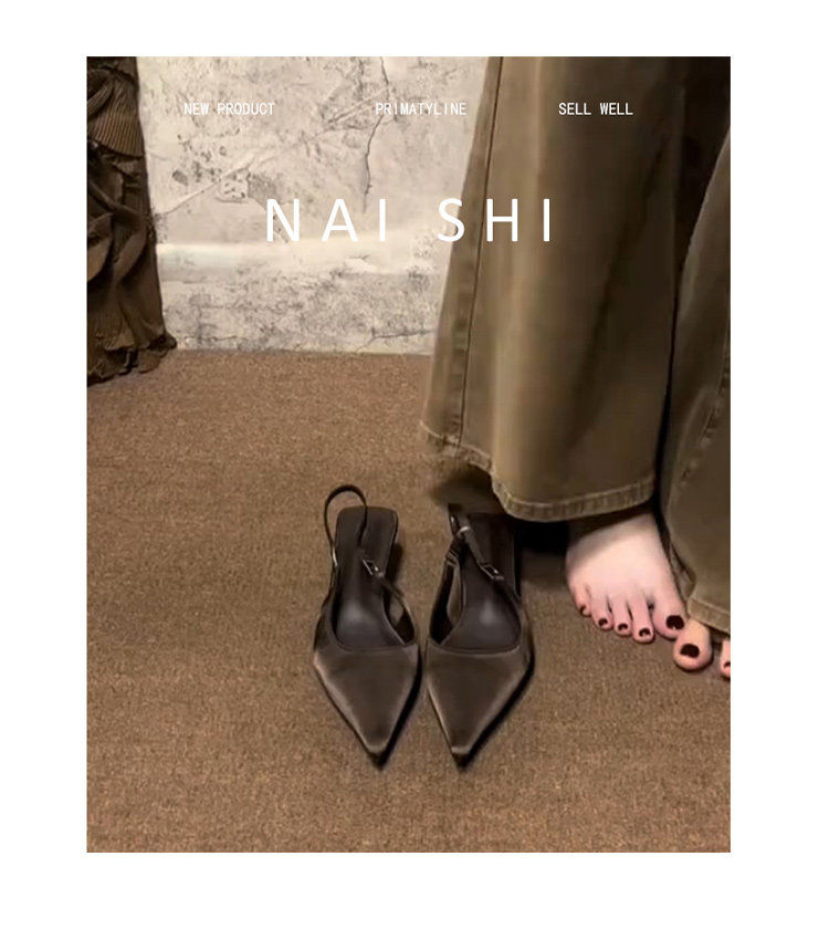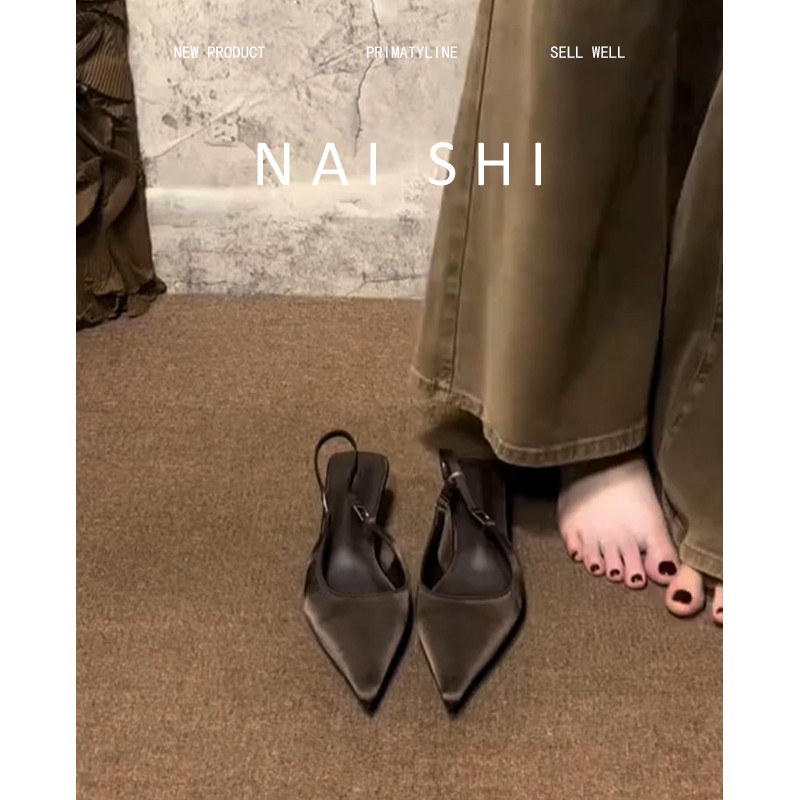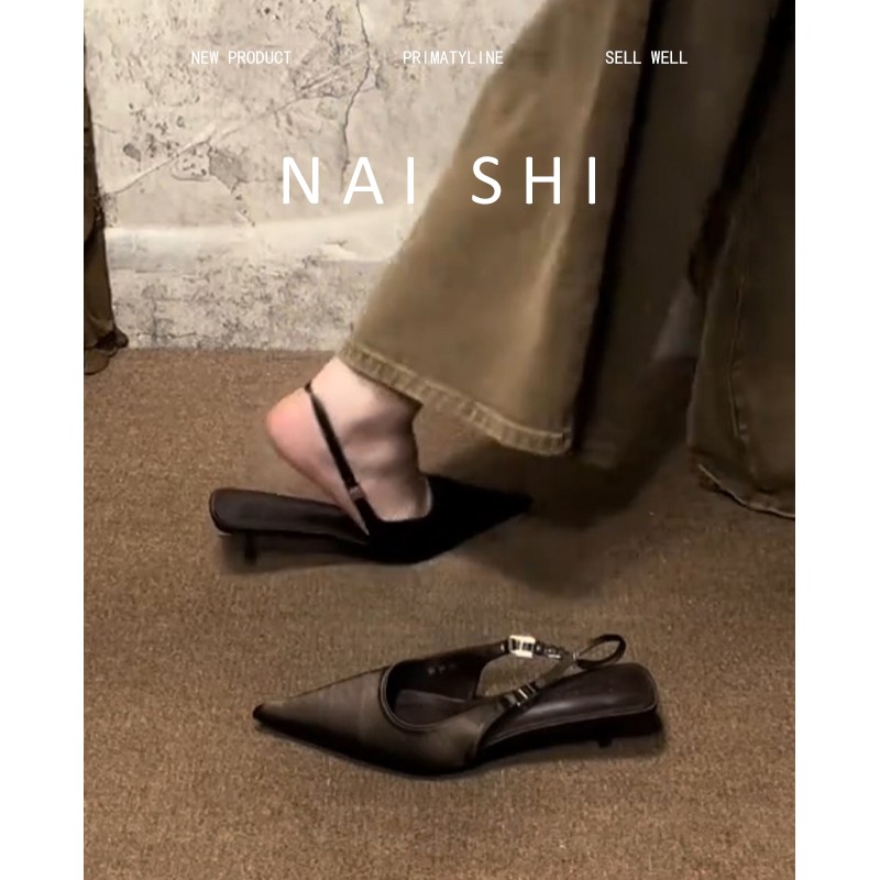 羊皮版!复古尖头绸缎包头凉鞋女设计感小猫跟气质浅口后空单鞋
