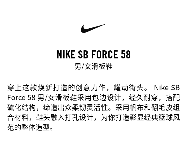 | 产品名称 : | 耐克男女透气平底滑板鞋冬季情侣翻毛皮NIKE SB FORCE 58 DV5477 |